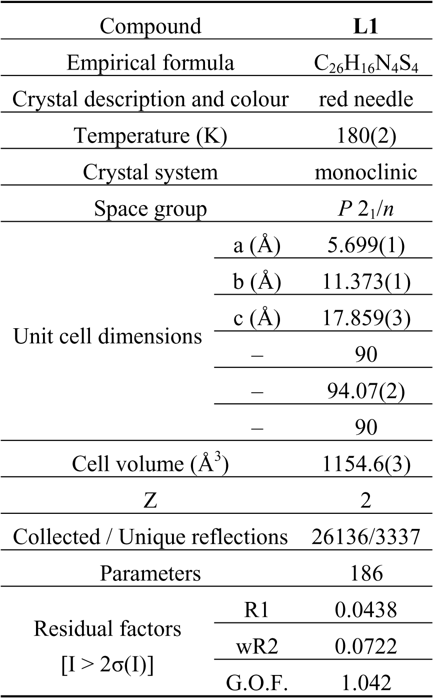 X-ray single-crystal diffraction data were collected at low temperature on a Bruker KappaCCD diffractometer, equipped with a graphite monochromator utilizing MoKα radiation (λ = 0.71073 Å). The structure was solved by direct method and refined on F2 by full matrix least-squares techniques using SHELX97 (Programs for Crystal Structure Analysis (Release 97-2). Sheldrick, G.M. [56]) package. All non-hydrogen atoms were refined anisotropically. Absorption was corrected by SADABS program (Sheldrick, Bruker, 2008). The H atoms were found by Fourier difference map. CCDC reference number CCDC 951195 (L1) contains the supplementary crystallographic data for this paper. These data can be obtained free of charge from The Cambridge Crystallographic Data Centre [57].