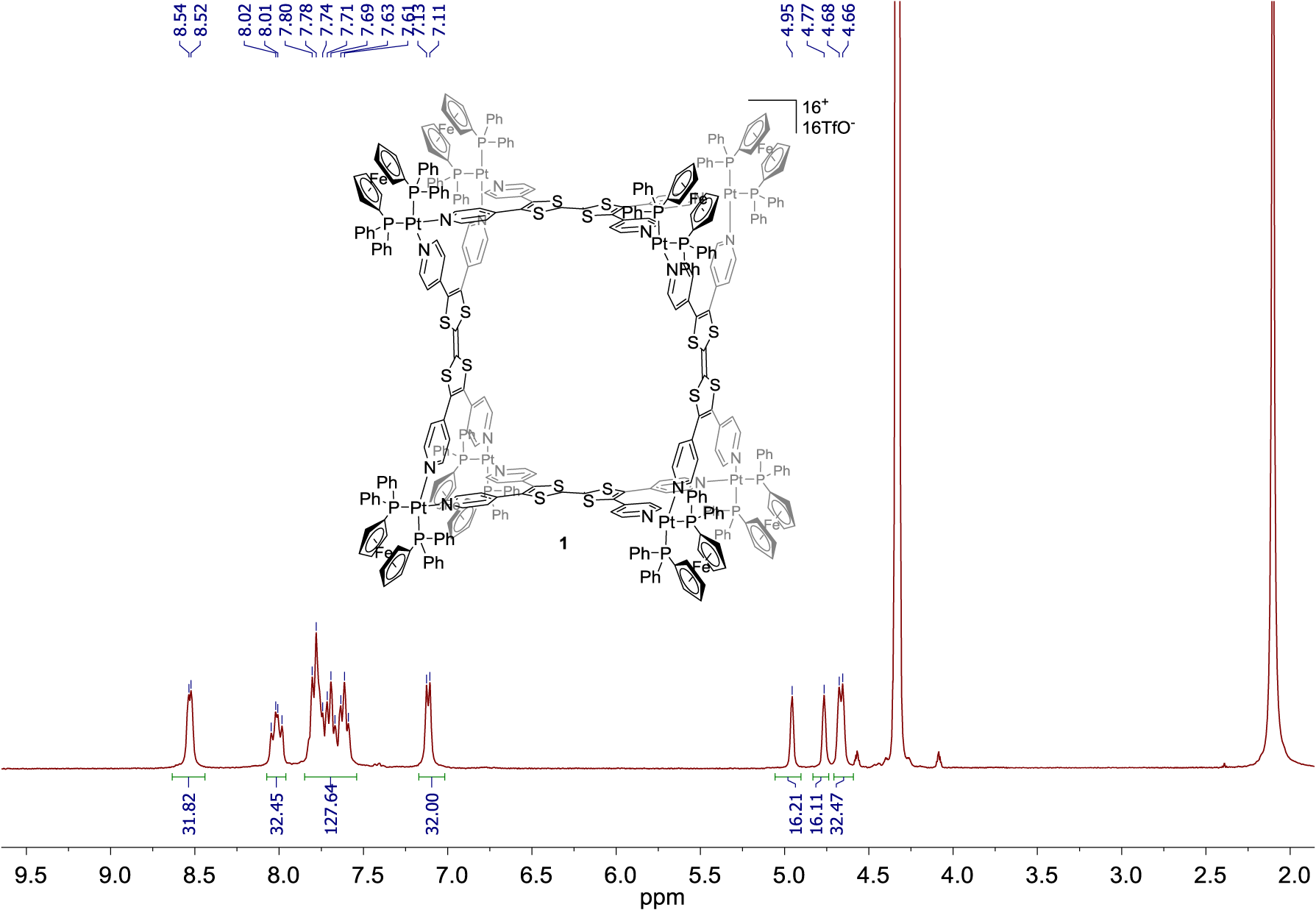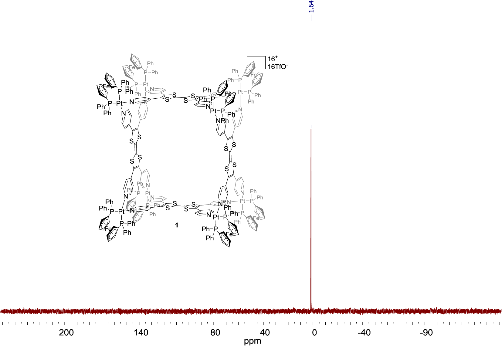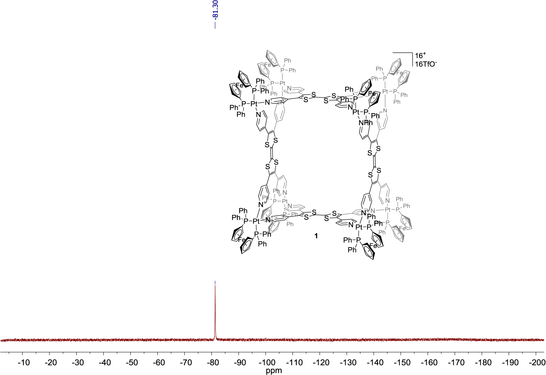 A mixture of ligand L1 (10.0 mg, 19.5 μmol) and cis-Pt(dppf)(OTf)2 (40.9 mg, 39.1 μmol) in anhydrous nitromethane (2 mL) was heated at 50 °C for 2 h under argon. After cooling, diethyl ether (10 mL) was added and the mixture was centrifuged. The residue was washed with diethyl ether and dried under vacuum to give complex 1 (46.3 mg, 4.4 μmol, 91%) as a dark orange solid. 1H NMR (CD3NO2) δ = 8.53 (d, 3J = 5.9 Hz, 32 H), 8.01 (m, 32 H), 7.80–7.61 (m, 128 H), 7.12 (d, 3J = 5.9 Hz, 32 H), 4.95 (brs, 16 H), 4.77 (brs, 16 H), 4.67 (m, 32 H); 19F NMR (CD3NO2) δ −81.30; 31P NMR (CD3NO2) δ = 1.64; ESI-MS m/z: 1937.0275 ([1-11OTf]5+), 2459.0238 ([1-12OTf]4+), 3327.6752 ([1-13OTf]3+); mp > 260 °C.