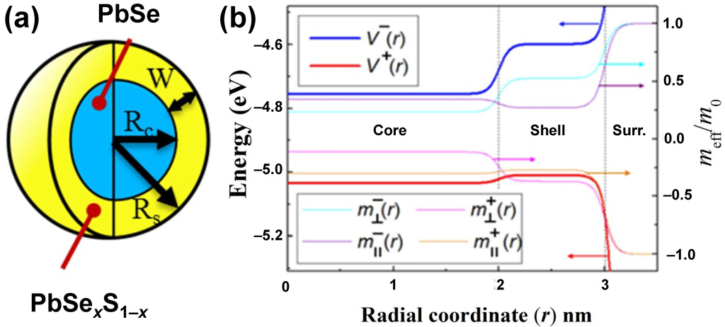 (a) Schematic representation of a QD heterostructure with alloyed-shell composition and general chemical formula PbSe/PbSexS1–x, where 0 ≤ x ≤ 1. Rc and Rs are the core and shell radius, respectively, and W is the shell thickness; (b) P lot of the conduction and valence band-edge energies, V−/+ (left axis), and the remote band contributions to the valence and conduction band effective masses,