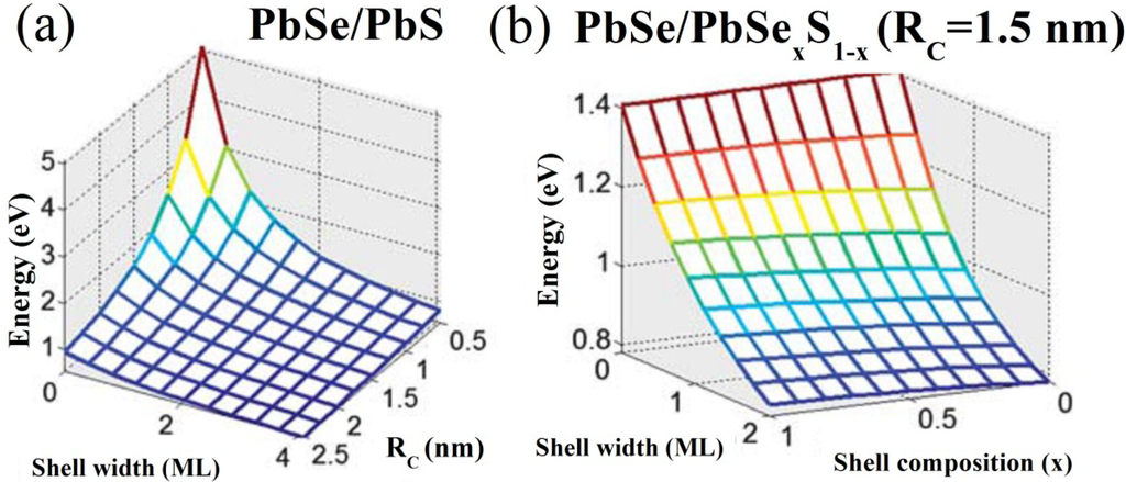 Variation of the ground-state exciton energy, Eg, with (a) core radius, Rc, and shell thickness, W, in PbSe/PbS QDs, and (b) shell thickness, W, and composition, x, in PbSe/PbSexS1–x core/alloyed-shell QDs with Rc = 1.5 nm. ML stands for “monolayer”.