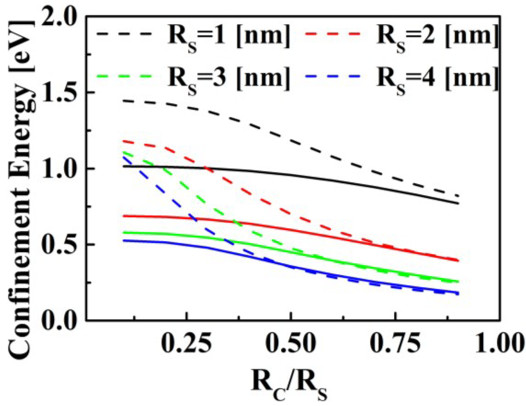 Effect of total QD radius, RS, and core-to-shell radius ratio, Rc/Rs, on the confinement energy of electron (solid lines) and hole (dashed lines).