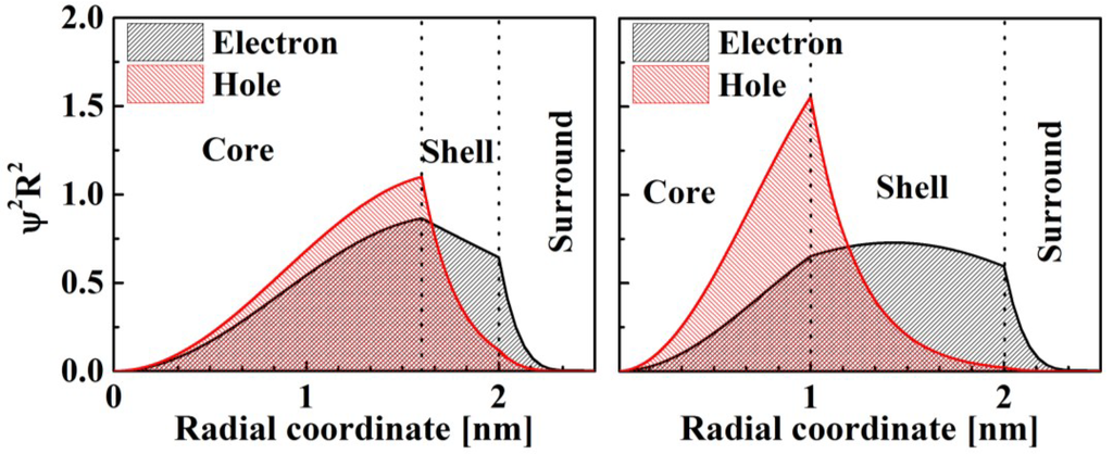 ) probability distribution of the charges in heterogeneous PbSe/CdSe core/shell QDs and in the surrounding medium. Since the confinement energy of the hole is higher than that of the electron (Figure 6). Therefore, the electron is delocalized from the core towards the shell, while the probability of finding the hole in the shell decays exponentially as the shell thickness increases. As a result, the hole is localized inside the core (Figure 7).
