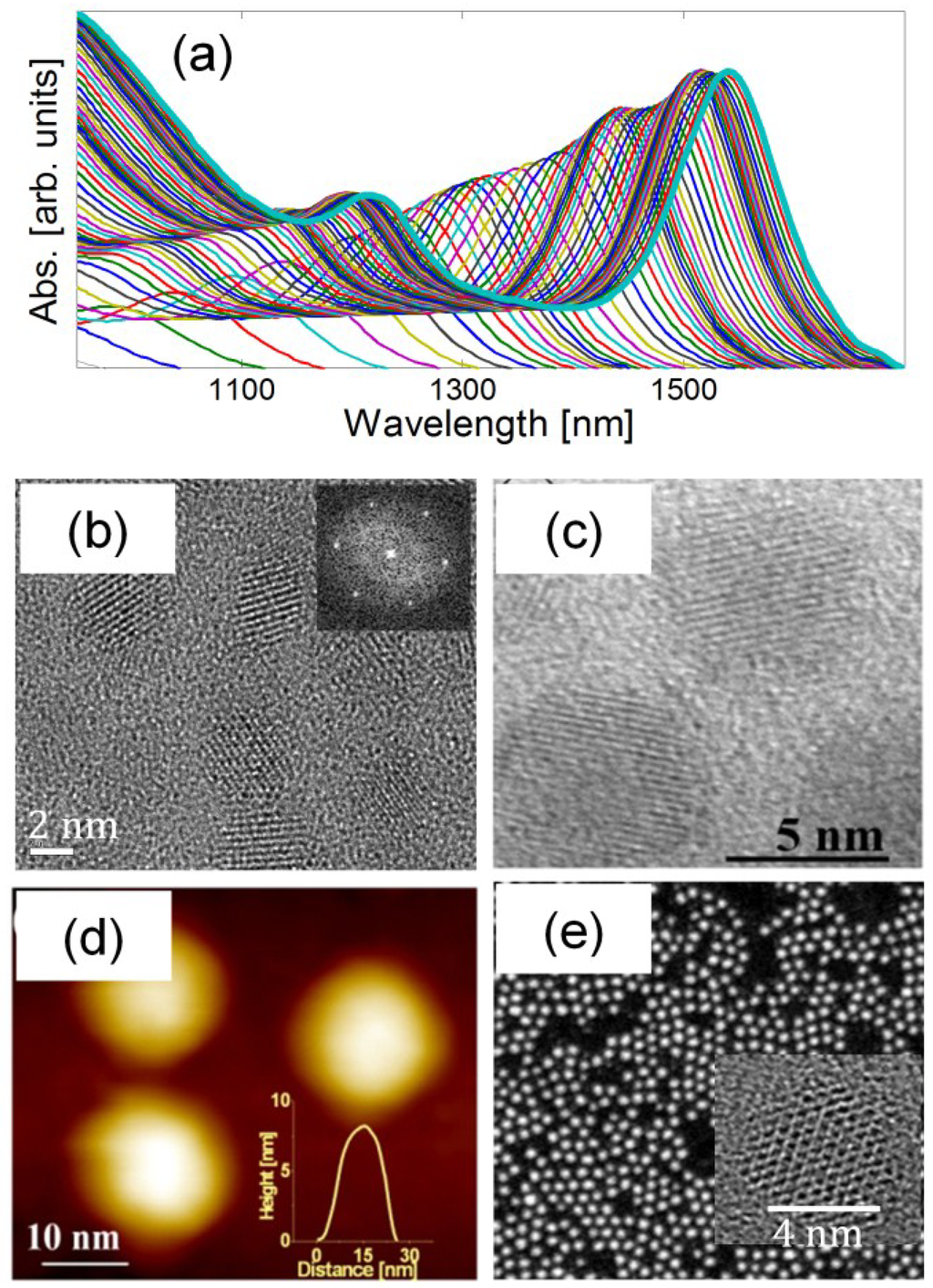 (a) Representative absorption spectra of PbSe QDs monitored in situ during their synthesis and recorded with a time interval of 10 s; (b) HRTEM image of PbSe/PbS QDs; Rs/Rc = 2.1/1.5 nm. Inset: FFT pattern of the same QDs; (c) HRTEM image of PbSe/PbS QDs; Rs/Rc = 3.0/1.5 nm; (d) STM image of PbSe/PbS QDs; Rs/Rc = 4.0/1.5 nm. Inset: Height profile of a single QD; (e) STEM image of PbSe/PbSexS1–x core/alloyed-shell QDs; Rs/Rc = 2.5/1.5 nm. Inset: HRTEM image of a single QD.