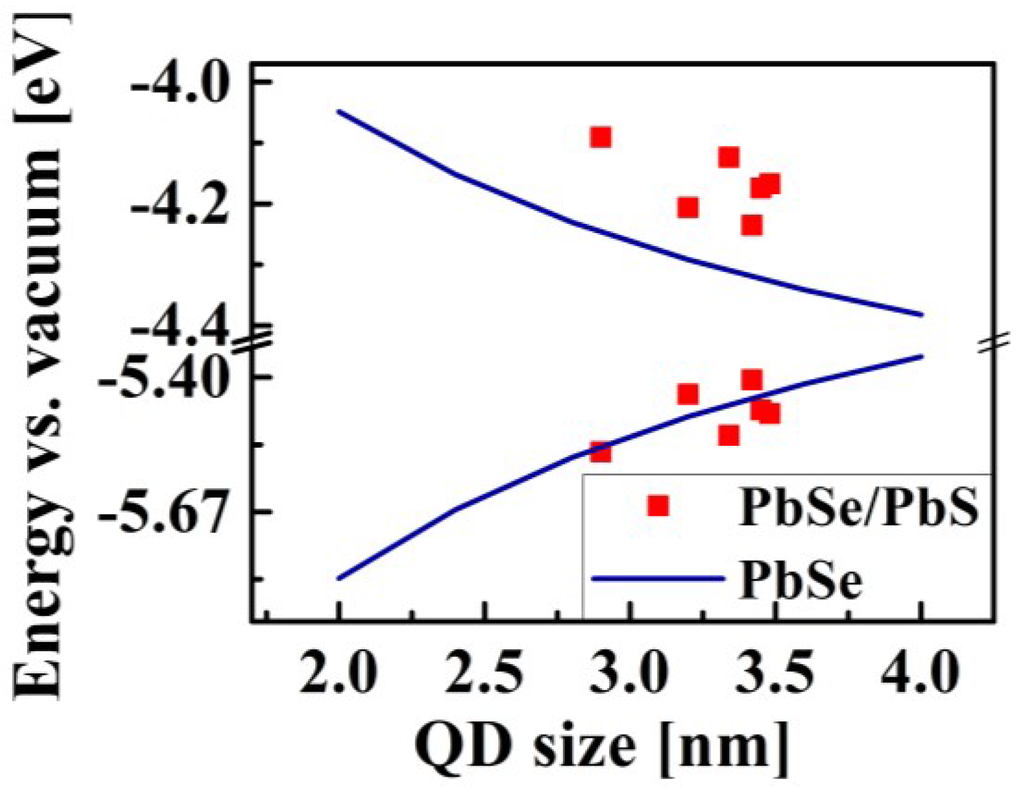 The absolute positions of the lowest quantized electron and hole energy levels in QDs, which are essential for their application in photovoltaic devices, are presented in Figure 14. These energy level values in the PbSe core (blue lines) and PbSe/PbS core/shell QDs (red dots), were estimated using the following formulas: Ee (d) = χbulk + ηEconf. (d) for electrons and Eh (d) = χbulk − Eg bulk − (1 − η) Econf. (d) for holes, where d is the QD diameter, χbulk is the bulk PbSe electron affinity, Econf. (d) = Eg QD (d) − Eg bulk is the total confinement energy, and η is the fraction of Econf. acquired by the electron. The values of χbulk were taken from the cyclic voltammetry measurements reported before [118], the blue line was evaluated using the Eg QD values from the empirical sizing curve [109], while the red dots were based on the experimental data obtained in this work (some of which are presented in Figure 14). According to the four-band k•p model, in the PbSe/PbS QDs studied here, the total confinement energy is distributed evenly between the electrons and the holes (which means that η = 0.5), while in the PbSe QDs, η = 0.42. It can be seen from Figure 14 that the conduction-edge energy in the PbSe/PbS QDs is higher than that in the PbSe QDs of the same size, which results in the heterostructure with altered band-gap energy relative to the vacuum level. These results correlate well with our previous calculations [95], and thus it can be suggested that the absolute energy of the band edges can be tuned with respect to the energy of the electrodes in various optoelectronic applications, thereby improving the performance efficiency.