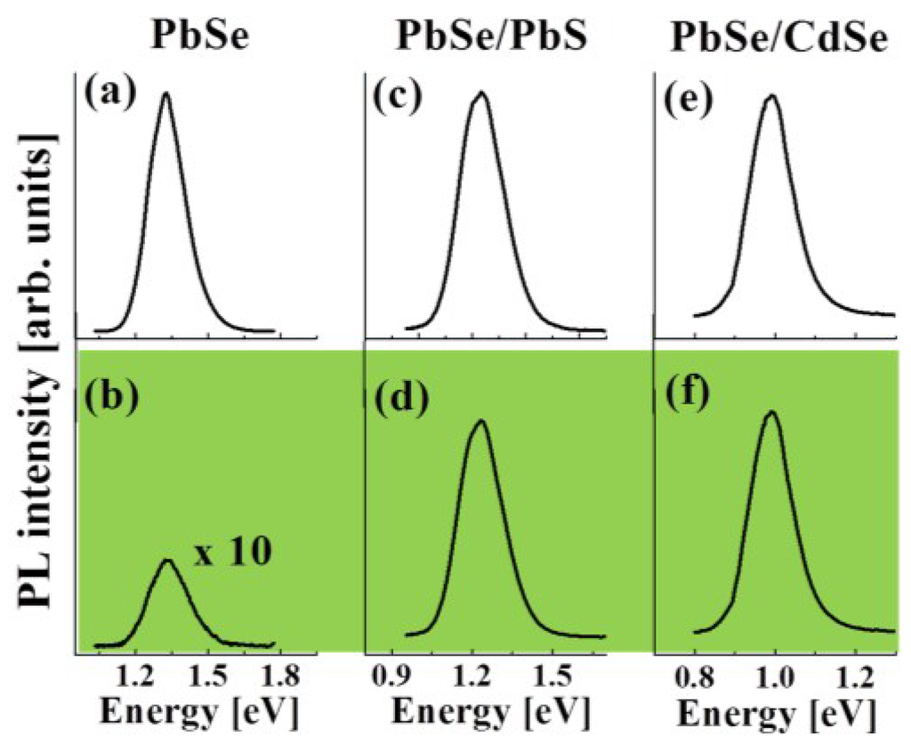 4.1. Continuous-Wave Room-Temperature Photoluminescence Measurements in PbSe/PbSexS1–x and PbSe/CdSe QDs