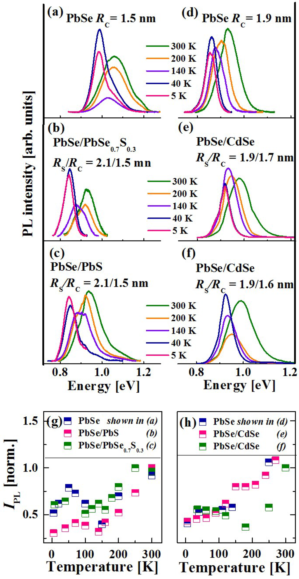 cw-PL spectra of air-free (a), (d) PbSe core; (b) PbSe/PbS core/shell; (c) PbSe/PbSe0.7S0.3 core/alloyed-shell; (e,f) PbSe/CdSe core/shell QDs with different Rs/Rc values (see the legend); (g,h) plot of normalized cw-PL integrated intensity, IPL, vs. temperature for the same QDs as in (a–f), see the legend.