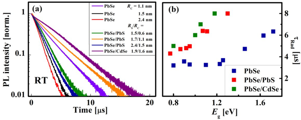 In what follows, the optical properties of various-sized core and core/shell QDs with the Eg of 1.2–0.92 eV are compared. Representative absorption and cw-PL spectra of a few QDs are shown in Figure 13a. The cw-PL spectra were obtained by means of non-resonant excitation at 2.3 eV. The bottom and top curves in Figure 13a correspond to PbSe core QDs with average radii RC of 1.5 ± 0.2 and 2.4 ± 0.2 nm, respectively. The curves in the middle are the spectra of different QD heterostructures (PbSe/PbS and PbSe/CdSe core/shell QDs and PbSe/PbSe0.7S0.3 core/alloyed-shell QDs), their sizes being indicated in the figure. The absorption and PL curves of PbSexS1–x QDs are red-shifted as compared to the 1.5 nm PbSe cores, but they are blue-shifted as compared to the 2.4 nm PbSe cores. This midway shift is related to the quantum size effect combined with compositional tuning of Eg. In contrast to this, the absorption and PL peaks in PbSe/CdSe core/shell heterostructures are blue-shifted as compared to the original PbSe QDs and correspond to the PbSe core lowest exciton transition, 1Se–1Sh. The results presented in Figure 13a demonstrate that the 1Se–1Sh transition energy in 3.8 nm PbSe/CdSe QDs is higher than that in PbSe/PbSexS1–x QDs. This observation indicates that tuning of Eg can be achieved by changing not only the total QD size, but also the heterostructure composition, in accordance with the theoretical predictions discussed in Section 2.