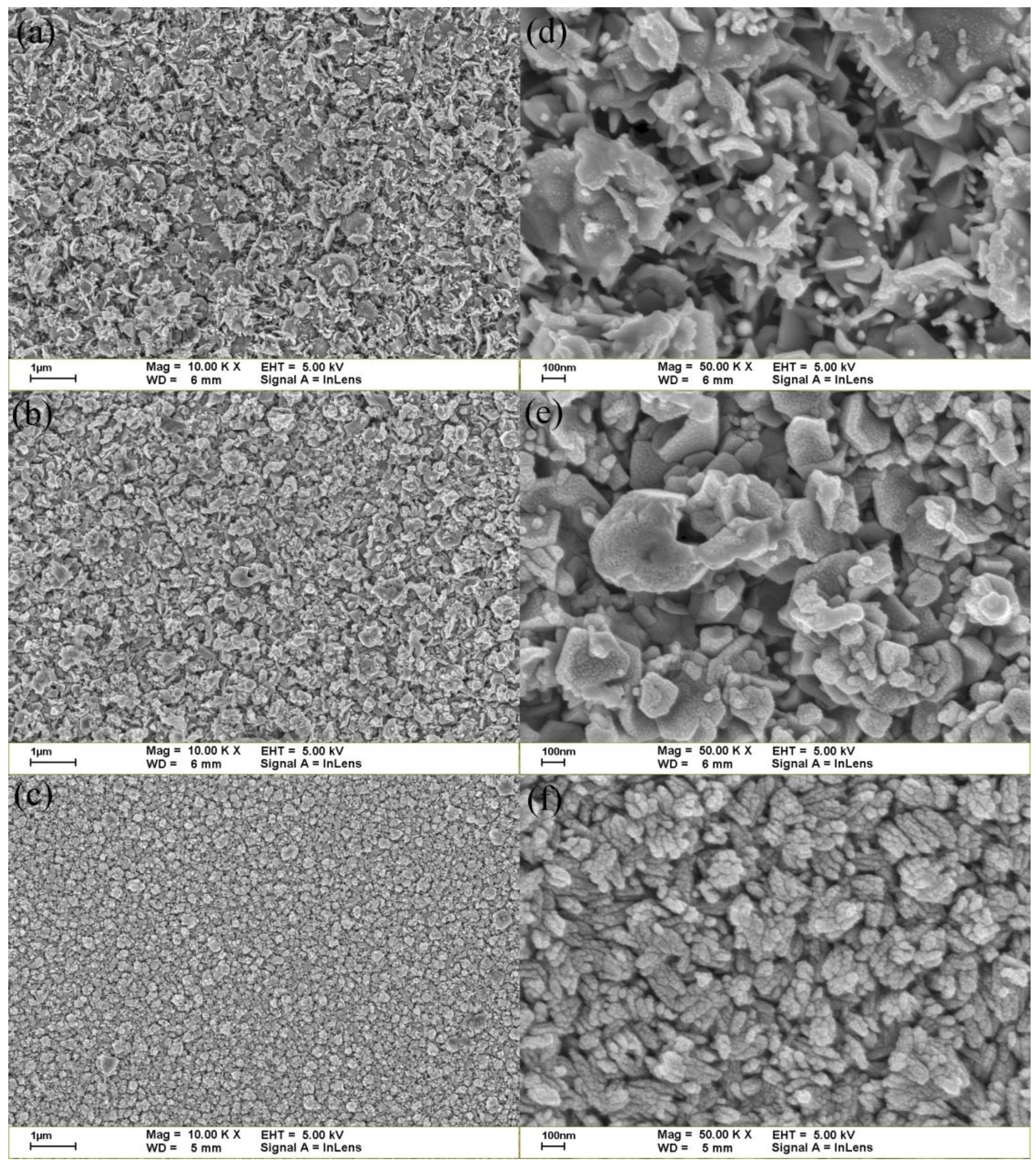 SEM images of (a) Zn0.98Cu0.02O; (b) Zn0.96Cu0.04O and (c) Zn0.94Cu0.06O. (d–f) show the images in (a–c) at five times greater magnification, respectively.
