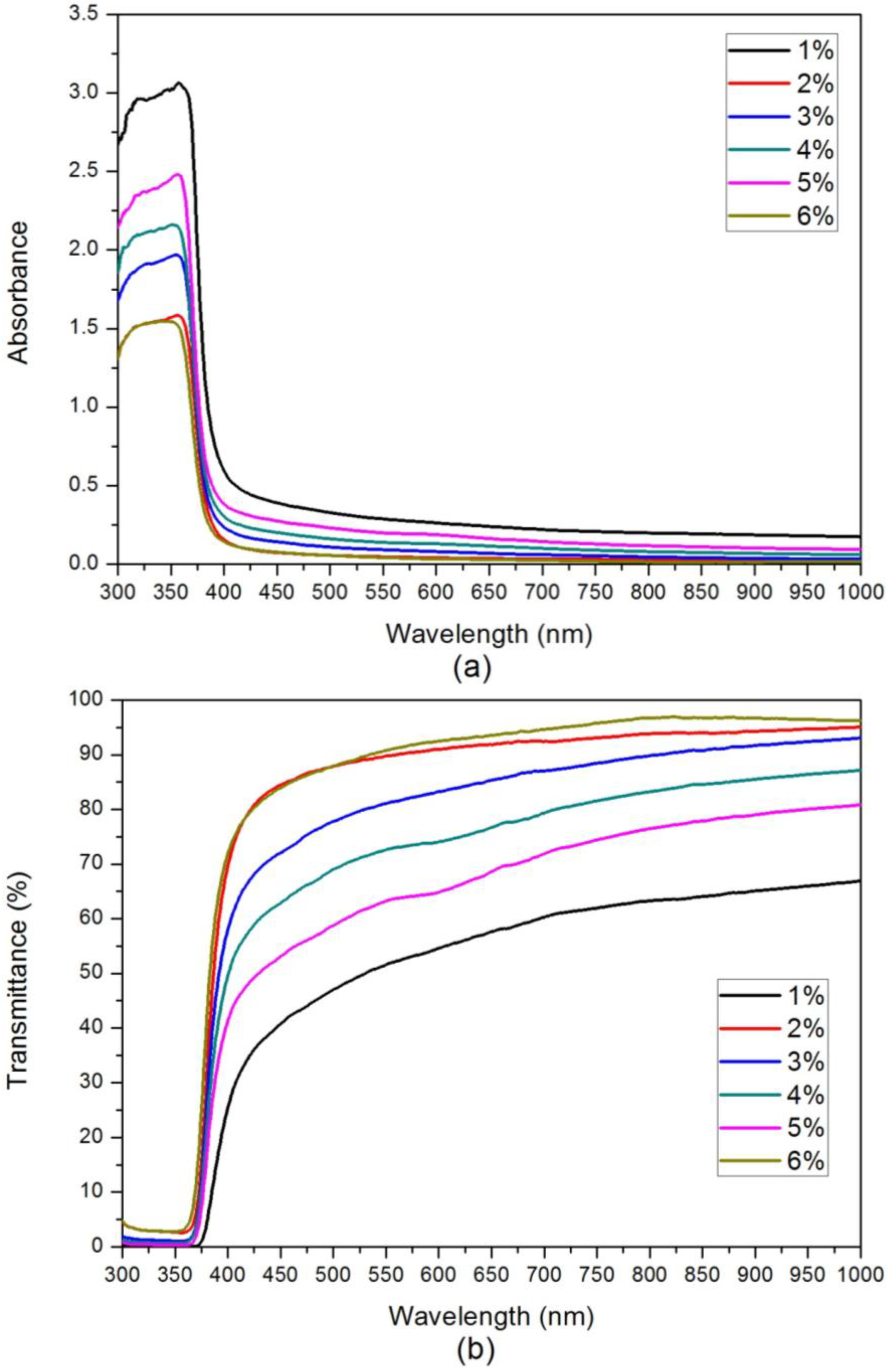 The results of UV-Visible absorption and transmittance measurements are shown in Figure 3. Figure 3a shows that the sharp UV absorption edges of all the CZO films are in the range of 385–410 nm. The absorbance was calculated by the following equation [26]: