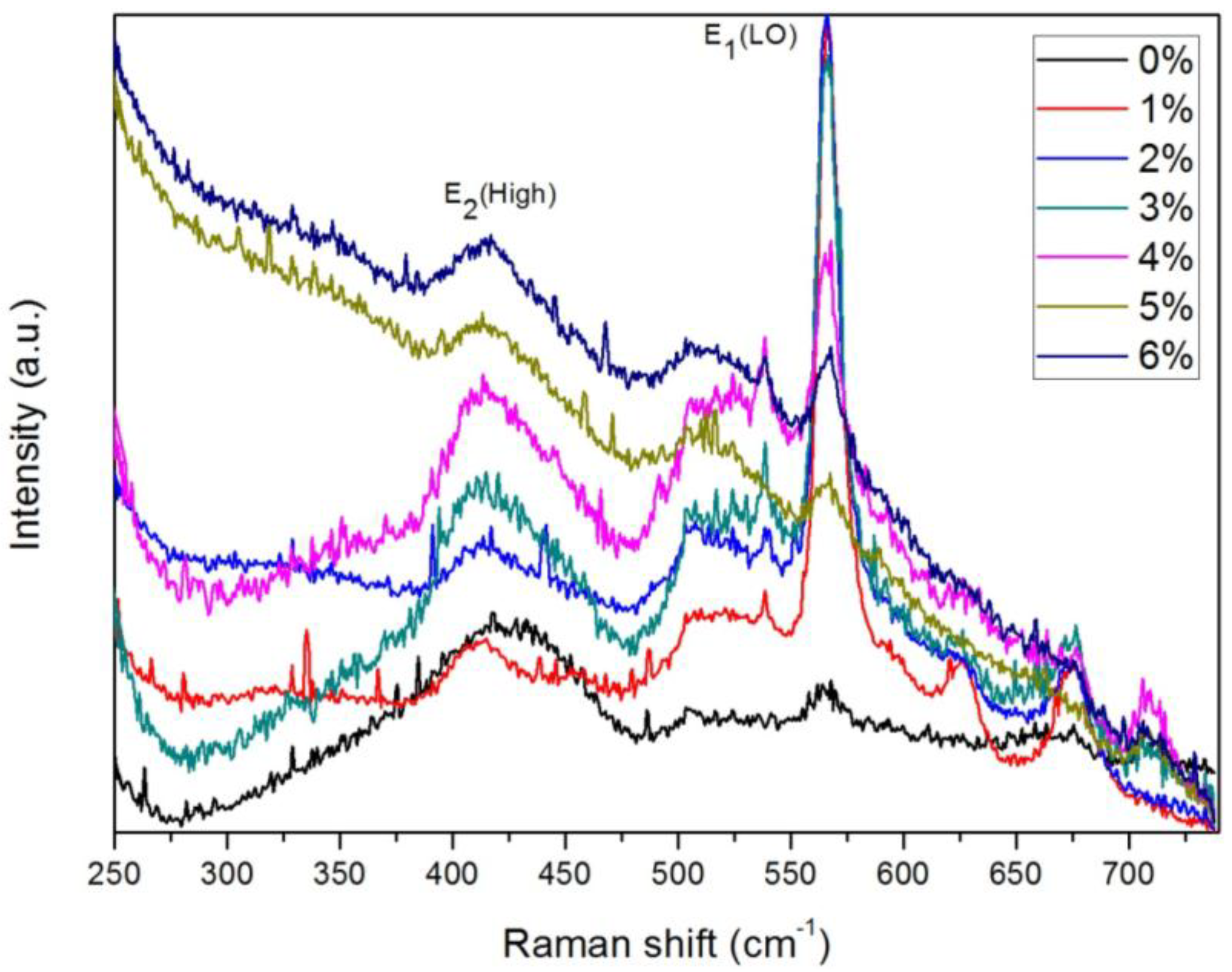 Figure 4 shows the room temperature Raman spectra of the CZO thin films, demonstrating the influence of Cu-doping on the ZnO structure. The E2 (high) mode is characteristic of the wurtzite phase [27]; the intensity of the E2 peak increased with increasing Cu concentration. The spectra also indicate peak shifting from 425 cm−1 to 415 cm−1 with increasing Cu doping amount compared to the ZnO thin film; this frequency shift was caused by the lattice defects and lattice disorder [28,29]. The peak at about 566 cm−1 is assigned to the E1 longitudinal optical (LO) mode [E1(LO)] and was caused by oxygen vacancy and Zn interstitial defects [30,31,32].
