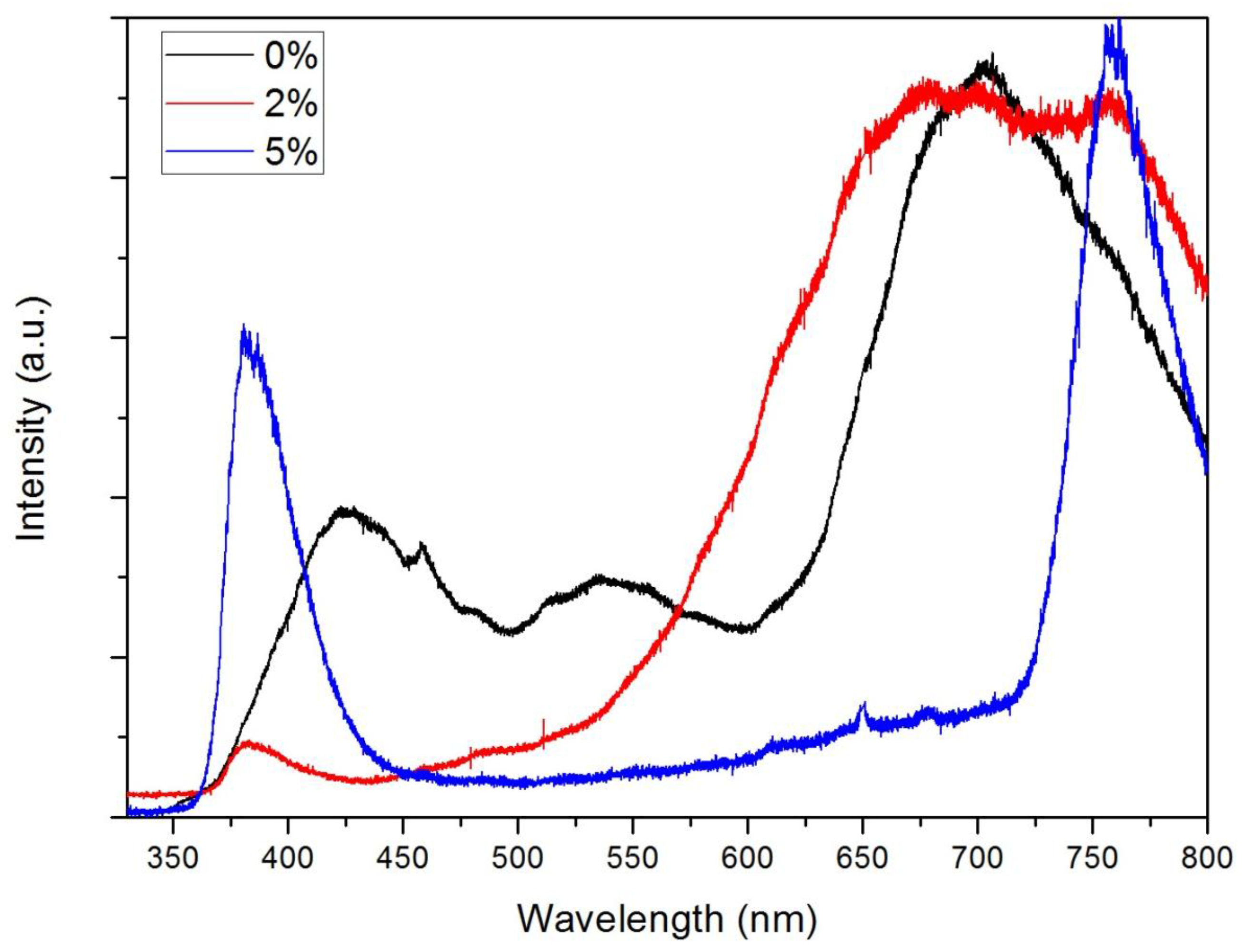 A photoluminescence study was conducted to investigate the effect of Cu doping on the quality and wavelength of emission. Figure 5 shows the photoluminescence spectra of the CZO thin films. The peak at 424 nm is attributed to the wurtzite structure of ZnO. With Cu-doping, the peak shifted and an ultraviolet emission attributed to the near band-edge free-exciton transition appeared at 380 nm [33,34]. This result is in good agreement of the shift in absorption edge with increasing Cu concentration. A broad yellow-red emission from 600 nm to 750 nm is also observed [35] due to copper impurities or oxygen vacancies. Many intrinsic or extrinsic defects such as antisite oxygen, surface defects, and zinc vacancies have been reported in the visible region [36,37].