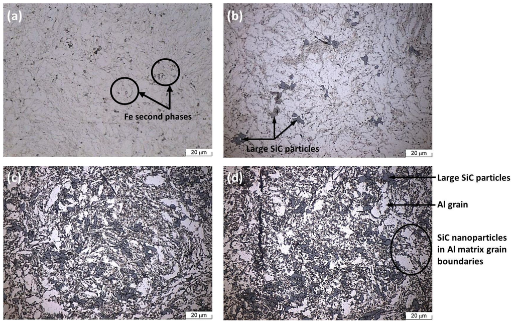 The optical micrographs in Figure 3 show the morphology of the unreinforced Al-PM alloy and Al/SiCnp composites etched by 0.5 vol% hydrofluoric acid (HF). The microstructure of the unreinforced Al-PM alloy (Figure 3a) shows the presence of second phases, enriched in Fe from the milled Al powders. The Al/1 vol% SiCnp composite (Figure 3b) shows the presence of large silicon carbide particles. The microstructure of the Al/5 vol% SiCnp and Al/10 vol% SiCnp composite was very similar (Figure 3c,d). Both composites show the typical microstructure of a PM processed material. As can be seen, the reinforcement particulates are distributed in the aluminum matrix, and due to a significant difference between the particle size of the SiC powder and the Al powder (Figure 1 and Figure 2), the SiC nanometric particles tend to fill in the gaps between aluminum powders during powder mixing. Some particles aggregate to form clusters in the Al matrix. This effect is most evident in the composite with higher SiCnp contents (5 and 10 vol%).