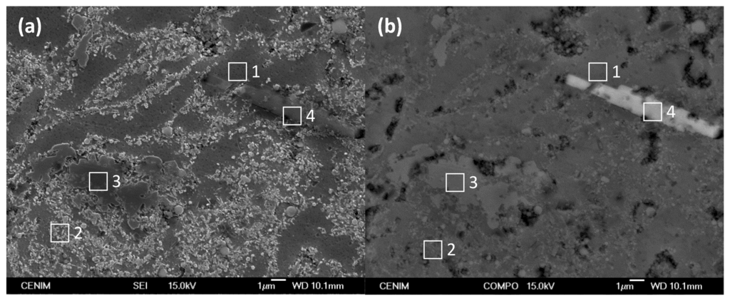 Figure 4 shows the constituent phases of the microstructure of the Al/5 vol% SiCnp in secondary electron imaging (SEI) and in backscattered electron imaging (BEI) mode, respectively. The corresponding chemical compositions are listed in Table 3. The dark grey areas observed in SEI mode (identified by No. 1 in Figure 4a) correspond to the aluminum matrix showing the lowest silicon content. In the same figure, light grey areas (e.g., No. 2) correspond to zones densely reinforced with small SiC nanoparticles. The larger particles, more clearly observed in BEI mode, (No. 3 in Figure 4b), are identified as SiC. Finally, in all of the specimens produced, including the unreinforced Al-PM alloy, the elongated white phases, (No. 4 in Figure 4b), are Fe-rich precipitates resulting from the presence of Fe impurities in the aluminum powder and the erosion of the grinding balls during the fabrication process. These precipitates are Al/Fe intermetallics, the size of which depends on the sintering temperatures [35].