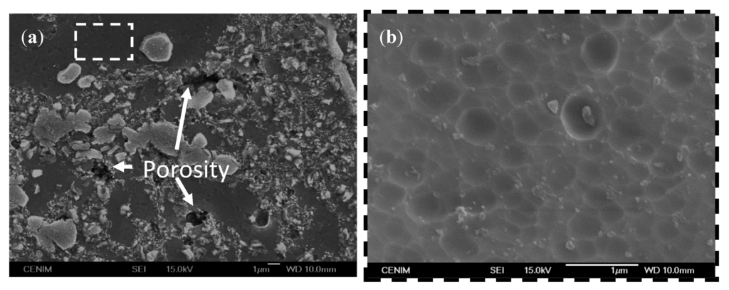 Before the anodizing process, the specimens were pre-treated in an alkaline bath in sodium hydroxide solution and then de-smutted in nitric acid solution. This is a common pre-treatment used in the aircraft industry for preparing the aluminum alloys surfaces before the anodization. The alkaline treatment promotes the formation of a smut layer composed of oxides, which is subsequently removed by immersion in the acid solution de-smutting. Figure 5a shows the pre-treated surface topography of the Al/5 vol% SiCnp composite. After the pretreatment, the surface reveals a high concentration of SiC particles, as well as some porosity in those areas where particles are concentrated. At higher magnifications, the areas with a lower presence of reinforcement particles (dotted line rectangle of Figure 5a) show a grooved surface, pointing out the composite dissolution during the alkaline etching; Figure 5b. This area is not entirely free of particles, since finer reinforcement particles are distinguished on the surface.