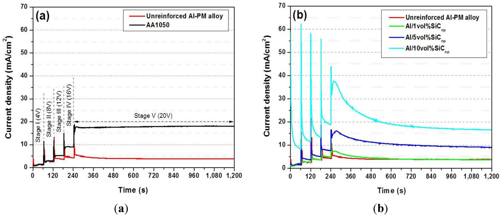 The current density-time response, Figure 6b, recorded for the unreinforced Al-PM alloy and Al/1 vol% SiCnp have similar features in the five stages. Surges, decays and plateaus of current density are analogous, presenting in Stage V a steady current density of about 4 mA·cm−2.