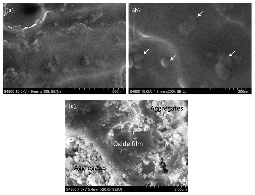 Figure 8a shows the top view of the porous anodic film grown on the Al/5 vol% SiCnp. The average pore diameter ranges between 5 and 15 nm. These values are similar in all of the specimens evaluated in this work. Thus, the pore diameter is not influenced by the reinforcement volume fraction or the processing method of the aluminum alloys. These values are in the same range as those reported in the literature for some aluminum alloys anodized under similar conditions [38,39]. Moreover, the surface of the 5 vol% SiCnp specimen also shows rounded morphologies of 30–80 nm in diameter that appear to be the SiC particles embedded in the film, as can be observed in Figure 8b (white arrows).