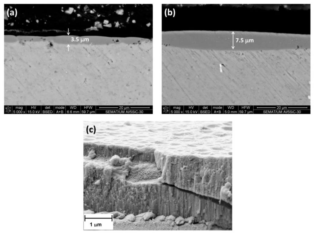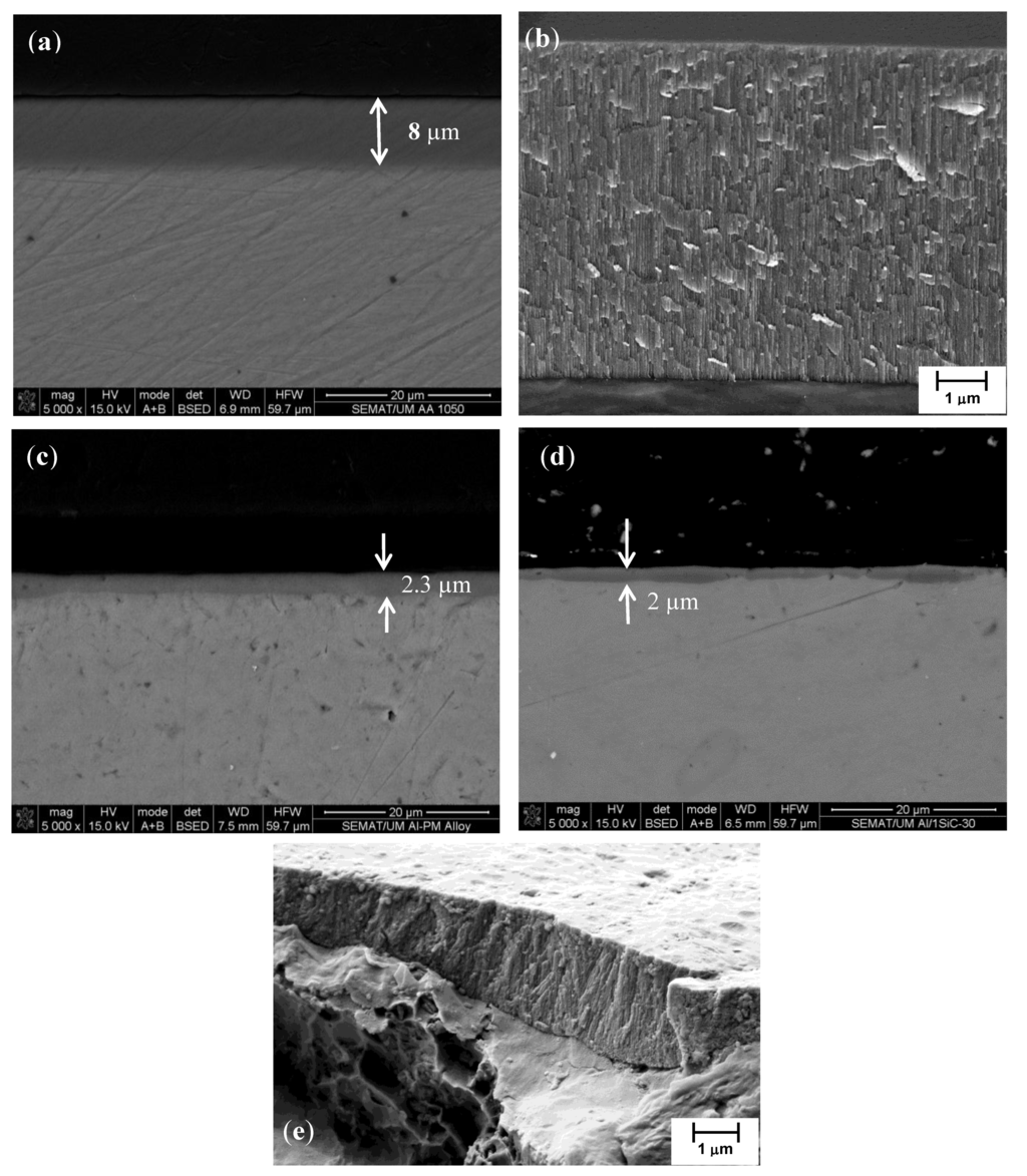 Conversely, for unreinforced Al-PM alloy (Figure 9c) and for Al/1 vol% SiCnp (Figure 8d,e), the oxide films are thinner and have a non-uniform thickness. The thickness of the anodic film is about 2.0–3.0 µm for the unreinforced Al-PM alloy and 0.6–2.1 µm for Al/1 vol% SiCnp.