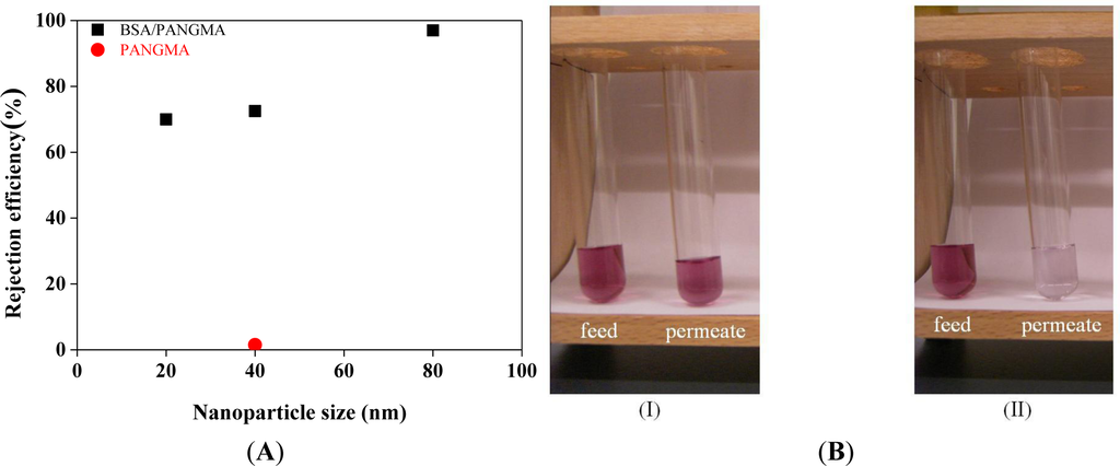 Retention ability of the BSA/PANGMA ENMs for Au nanoparticles is demonstrated in Figure 10A. While the neat PANGMA ENM is able to reject a negligible part (1.5%) of the 40 nm Au nanoparticles, the biofunctionalized ENM’s rejection efficiency is 72.5%.