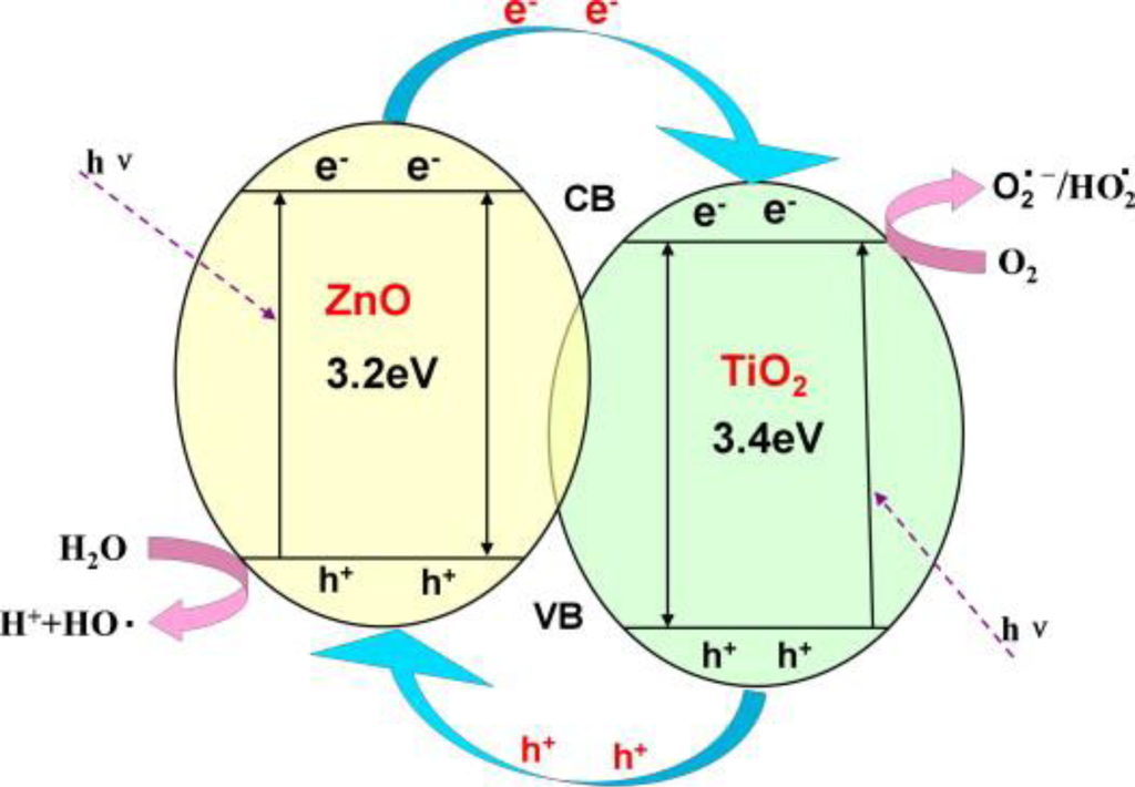 A capturing mechanism of organics will be perfected by a dissociation process. Organic pollutants, such as dyes and pesticides, are readily decomposed in aqueous solutions by photocatalysis at the presence of semiconductor metal oxides such as titanium oxide (TiO2), zinc oxide (ZnO), tin oxide (SnO2), and copper oxide (CuO). These materials due to their size-tunable physicochemical properties, high activities, durability, and low cost have been widely investigated in photocatalytic degradation of organic pollutants. In this regard, a major challenge is the fast recombination of photo-generated electron/hole pairs in the bulk semiconductors thereby lowering their photo-catalytic efficiency [29,63]. Composite materials by virtue of the different Fermi levels of the constituents could be a hindering solution. In addition, addition of nanoparticulate semiconductors to nanofibers, while maintaining their exposure at a high surface area, eases their recycling and prevents their aggregation.