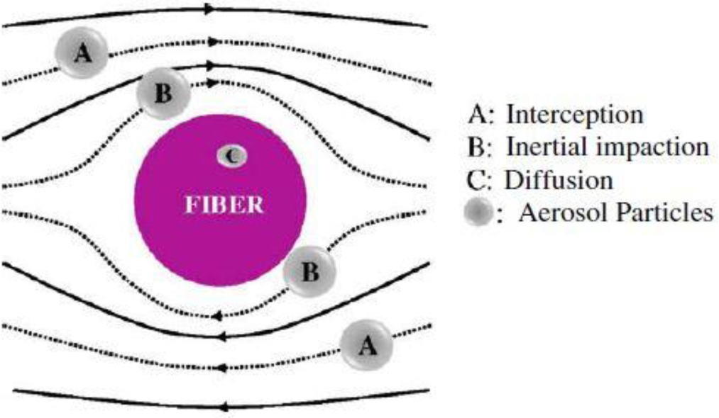 Air filtration is conventionally performed by fibrous filters primarily due to their high collection efficiency also durability. As shown in Figure 14, aerosol particles could be deposited on and captured by a fiber through five different mechanisms including: interception, inertial impaction, diffusion, gravitational force, and electrostatic attraction. Usually filtration of particles is done as a result of combination of all these mechanisms with different contributions. For instance, for most particle sizes, the gravitational force has the least role in filtration. To capture coarse particles, Brownian diffusion has an ignorable role while it is the dominant filtration mechanism for fine particles. For the submicron particles, the most important capturing mechanisms include Brownian diffusion, interception, and inertial impaction, as well as the electrostatic attraction [29].