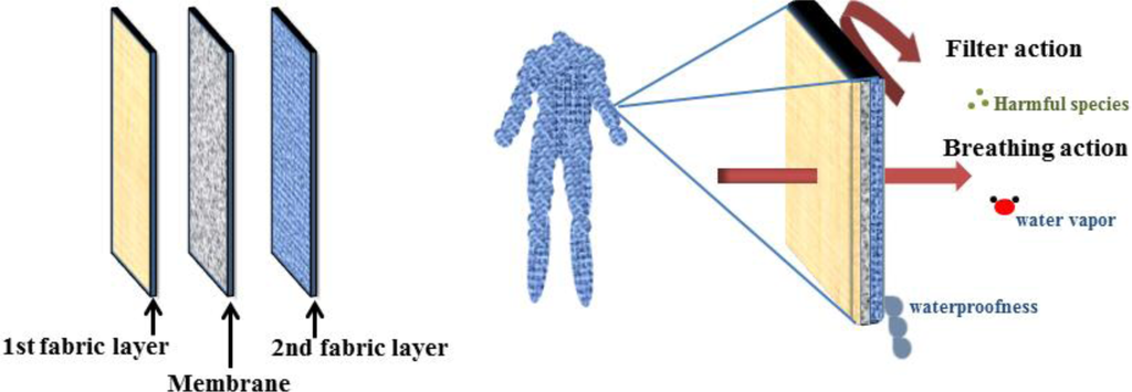 A fundamental requirement of suitable protective clothing is adaptability with the physiological conditions of the human body. Accordingly, while acting as a barrier against toxic and unwanted materials, such as aerosol particles, harmful vapors, and liquids, it should allow not only perspiration but also transportation of water vapor, thus creating a microclimate (Figure 15) [104].