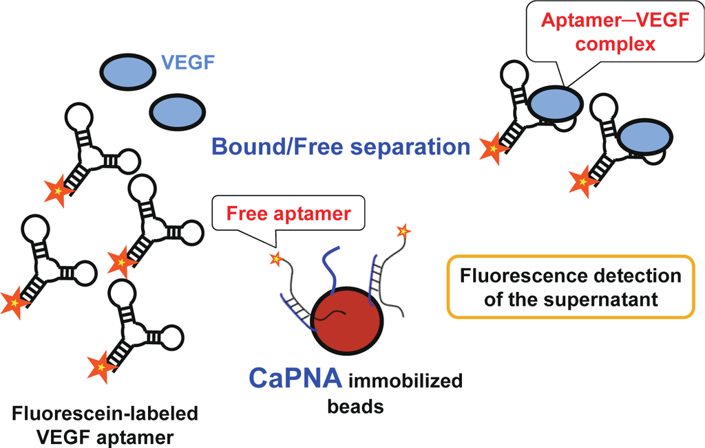 We have developed a bound/free separation system using a vascular endothelial growth factor (VEGF) aptamer and a peptide nucleic acid (PNA) to detect VEGF. In this system, we designed capture PNA (CaPNA), which hybridizes with the aptamer in the absence of the target protein, but does not hybridize with the aptamer in the presence of the target protein due to steric hindrance and/or stabilization of the aptamer’s structure. By removing the aptamers not bound to the target protein using CaPNA immobilized beads, we can detect the target protein by measuring signals labeled with the aptamer in the supernatant. In this study, we detected VEGF using CaPNA-immobilized beads without the time-consuming washing step. This simple and rapid system can detect 25 nM of VEGF in 15 min.1. Introduction
