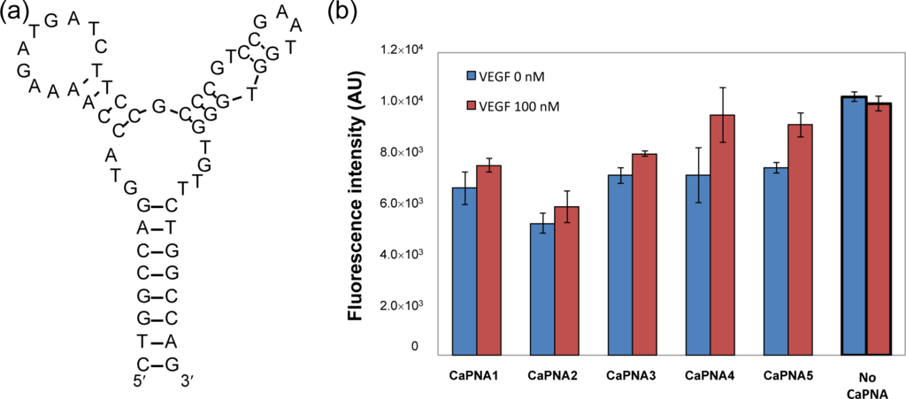 We designed CaPNAs that hybridize with the VEGF aptamer only in the absence of VEGF (Table 1). We used a 58-mer VEGF aptamer (Figure 2a) with a three-way junction predicted secondary structure. The Tm value of the secondary structure of the VEGF aptamer is 47°C, calculated by the mfold web server [13]. Previous mutational analysis has indicated that the predicted second stem-loop structure of the aptamer is important for VEGF binding. Therefore, we hypothesized that binding of VEGF to the aptamer would efficiently inhibit hybridization of the complementary PNA with the second stem-loop region of the aptamer. We designed five CaPNA candidates that are complementary to the sequence surrounding the predicted second stem–loop sequence of the aptamer with higher Tm values than the predicted Tm value of the VEGF aptamer. The five CaPNAs (CaPNA1, 2, 3, 4, and 5) have different lengths (11, 11, 10, 9, and 8-mer, respectively). CaPNA1 is complementary to the central region of the second stem-loop. CaPNA2 is complementary to the 3´ terminal region of the second stem-loop. CaPNA3, 4, and 5 are complementary to the 5´ terminal region of the second stem-loop sequence. CaPNA4 and 5 have a deletion of one and two base(s), respectively, compared to CaPNA3. The Tm values for hybridization of CaPNA1–5 to the aptamer were 62, 59, 65, 57, and 47°C, respectively, as calculated by the PNA probe designer [14].
