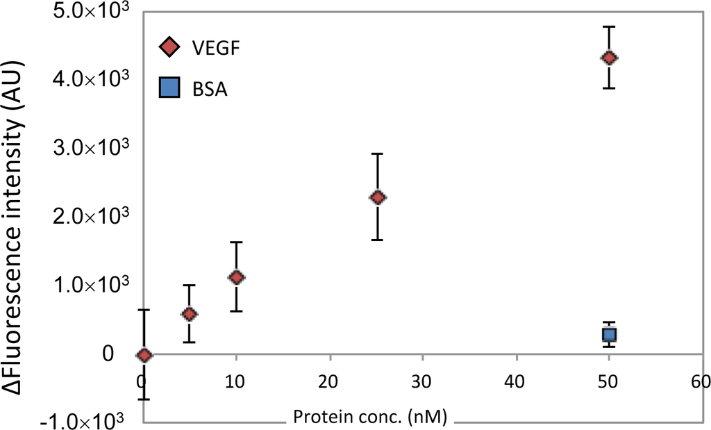 Next, we evaluated the concentration dependency of VEGF detection using CaPNA4-immobilized beads over a short time period. The VEGF aptamer and VEGF were incubated for 10 min, and the CaPNA4-immobilized beads and VEGF solution were incubated for 5 min. We observed an increase in the fluorescence intensity in a VEGF concentration-dependent manner (Figure 3). The magnitude of the fluorescence intensity depended on the VEGF concentration within the range of 5 nM to 50 nM, and the detection limit was 25 nM VEGF (S/N = 3). However, a slight increase in the fluorescence intensity was observed in the presence of bovine serum albumin (BSA). These data indicate that a concentration of 25 nM VEGF can be detected using the fluorescein-labeled VEGF aptamer and CaPNA4-immobilized beads in 15 min with a single B/F separation step.