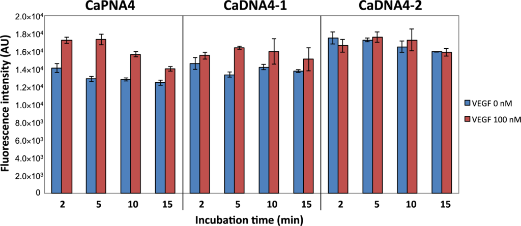 To evaluate the assay time required to detect VEGF in this system, we compared the capture efficiency of CaPNA4, CaDNA4-1, and CaDNA4-2 over a short time period. CaDNA4-1 is a 12-mer DNA with a Tm value similar to that of CaPNA4, and CaDNA4-2 is a 9-mer DNA (Table 1) that has the same sequence as CaPNA4. After a 2-min incubation of CaPNA or CaDNA-immobilized beads and the mixture of VEGF and the aptamer, a difference in the fluorescence intensities between in the absence and presence of VEGF was observed only for CaPNA4 (Figure 4). Furthermore, the capture efficiency of CaPNA4 was the highest of the three materials after a 5-min incubation. CaDNA4-2 failed to capture the free aptamer even after a 15-min incubation. This result indicates that the Tm value of CaDNA4-2, which was calculated to be 36°C, was too low to hybridize with the aptamer because the calculated Tm value of CaDNA4-2 is lower than that of the aptamer by about 20°C. On the other hand, CaDNA4-1 detected VEGF with a 5-min incubation. Because CaDNA4-1 has the same Tm value as that of CaPNA4, we expected CaDNA4-1 to show the same behavior as CaPNA4. However, CaDNA4-1 failed to capture the free aptamer after a 2-min incubation. Taken together, CaPNA resulted in more rapid detection of VEGF compared to CaDNA in this system.