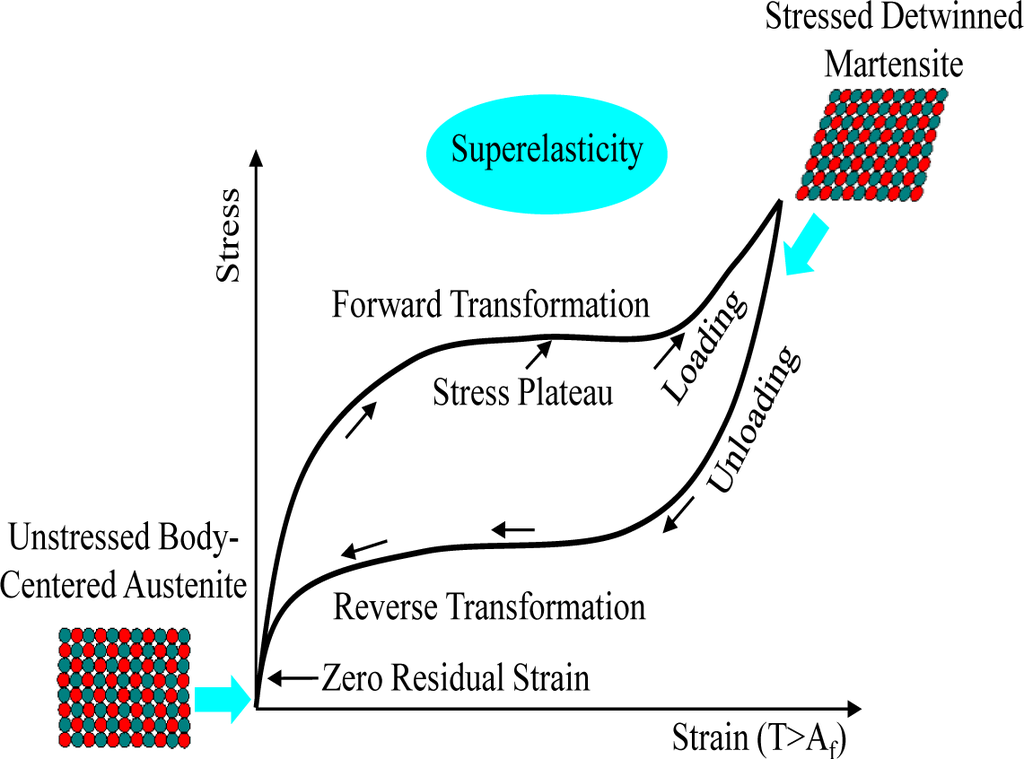 where indicates austenite start stress and indicates austenite finish stress. Total strain can be decomposed into two components, (a) a purely linear-elastic component (εe) and (b) a transformation strain component (εL) as follows: