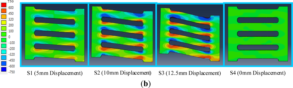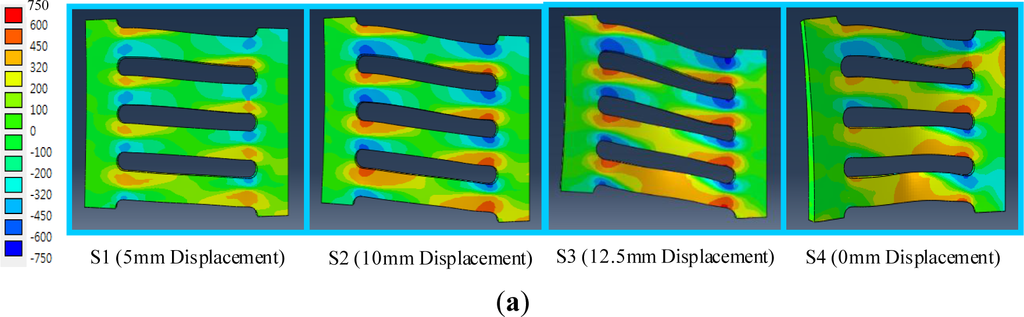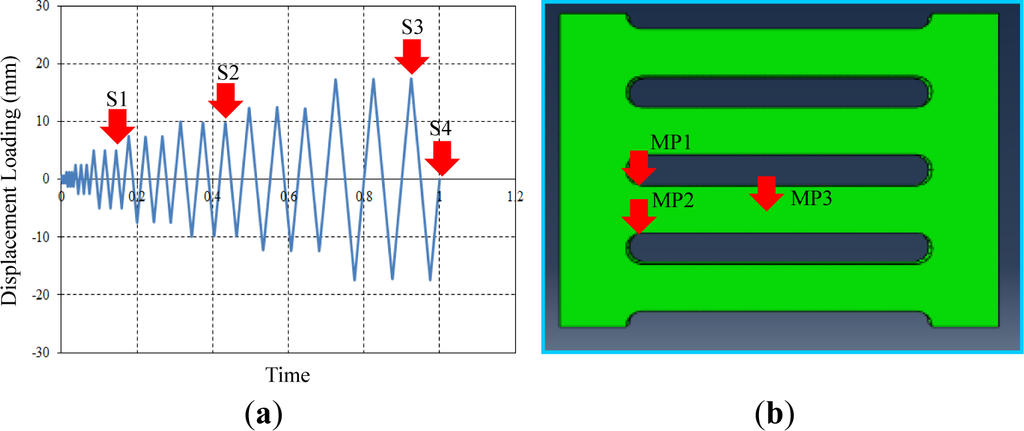 The test setup for collecting analysis data was developed on the basis of monitoring conditions. Individual target displacements for the field contour observation and measurement points (MPs) for monitoring stress-strain curves are described in Figure 10a,b, respectively. Four target displacements (e.g., S1 = 5 mm, S2 = 10 mm, S3 = 17.5 mm and S4 = 0 mm) were chosen during the cyclic tests performed with displacement loading history. Three set points used for independently measuring uniaxial stress and strain (e.g., MP1, MP2 and MP3) were installed in the FE model, as marked in Figure 10b. The measured data are collected using the history output function provided in the program [13]. Contrary to MP1, which was installed at the middle of the strip, both MP1 and MP2 can detect plastic hinges that generally form at the end of the strip. In particular, the stress-strain curves measured from these set points confirm the validity of the bending mechanism, as elucidated in Figure 4.