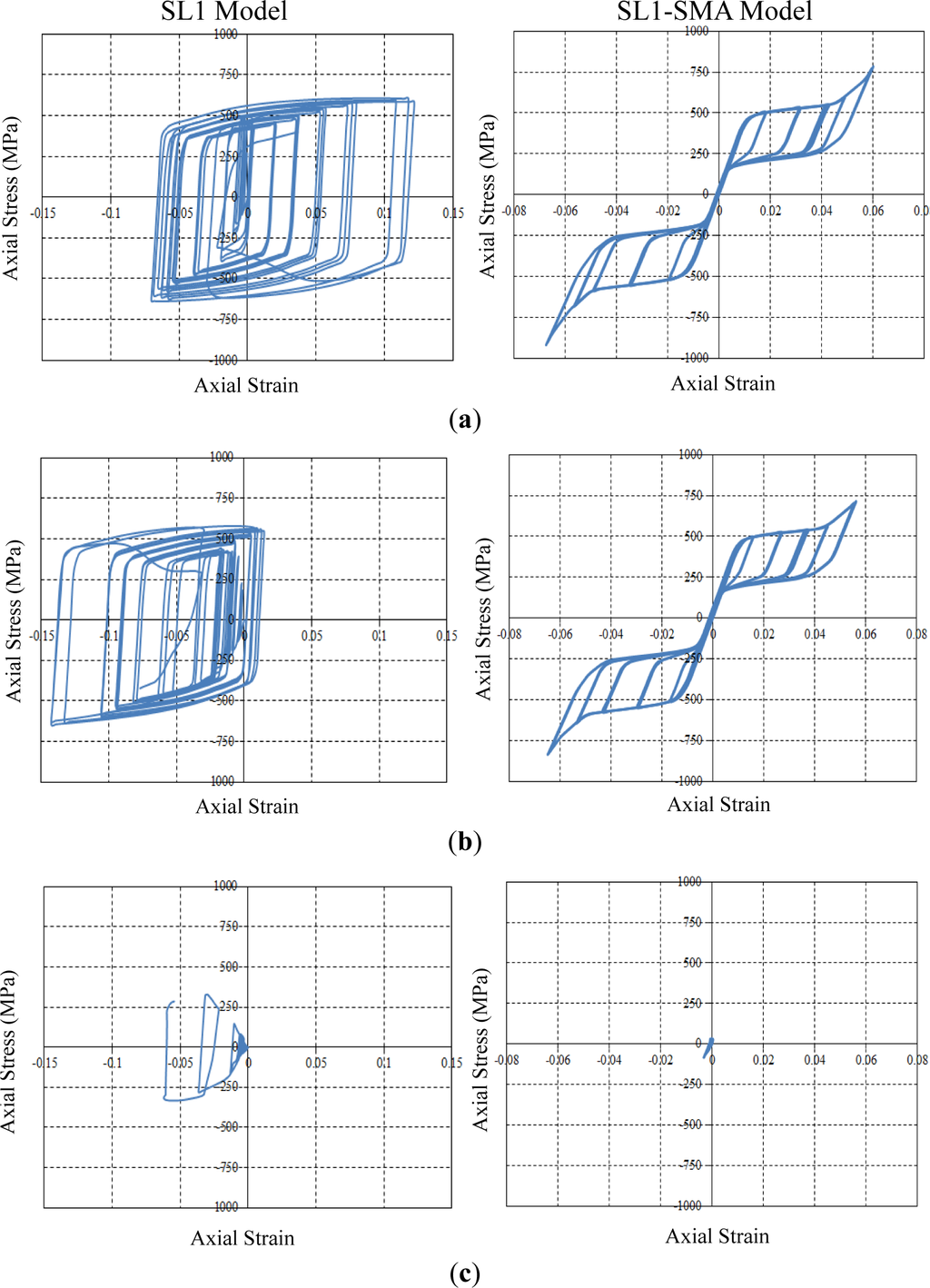 Figure 13 shows the true axial stress and strain curves obtained from the measurement points. For the SL1 specimen, the axial stress and strain curve measured from the MP1 point shifts its center to the right-hand side of the graph. Thus, the MP1 measurement point undergoes tension stress during most of the loading cycles. On the other hand, the MP2 measurement point is under compression stress, as shown in Figure 11a. Both curves exceed the limit of plastic yielding (316.5 MPa). The stress and strain curve measured from the middle of the strip (MP3 point) is under elastic conditions during all loading cycles. However, residual stress taken as 260 MPa exists at this measurement point. For the SL1-SMA specimen, both axial stress and strain curves measured from the MP1 and MP2 points are the symmetric flag-shape hysteresis loops similar to the inherent material behavior. Although both measurement points undergo a considerable amount of plastic deformation upon loading, this specimen can return to the original state upon unloading, owing to its recentering capability. Finally, the MP3 point is also under elastic conditions during all loading cycles. Contrary to the SL1 specimen, the SL1-SMA specimen shows almost zero residual stress, as shown in Figure 13c. It can be thus shown that the UMAT subroutine implemented herein is able to accurately predict mechanical stress, as well as the entire behavior for structures made of superelastic SMA materials.