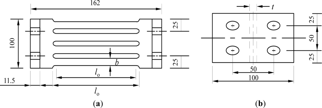 This device directly copes with shear forces transferred from the frame members (P) and the corresponding deformation (δ). The strips behave as fixed-end beams under relatively large displacement between two supported flanges. The bending mechanism of the strips is shown in Figure 4. Plastic hinges are likely to form at both ends of individual strips subjected to sufficient displacement. Thus, a significant amount of energy can be dissipated owing to these plastic hinges under the bending mechanism. The required parameters to describe the mechanical response of the slit damper, i.e., strip length (l0); strip depth (b) and web thickness (t), are also presented in Figure 3. The yield load of the slit damper (Py) can be defined under the plastic bending mechanism with the assumption of perfectly elasto-plastic material behavior as follows: