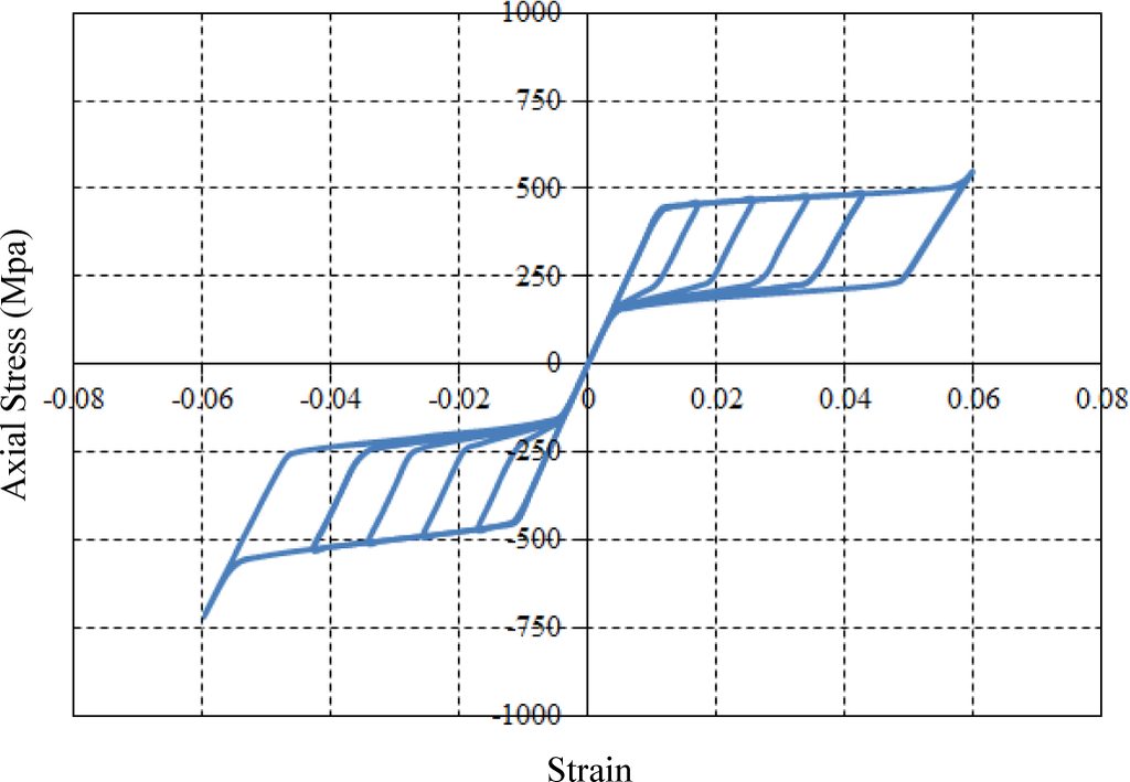 The material data required as input values to the UMAT subroutine are obtained from the observation of uniaxial tests with respect to loading, unloading and reloading under constant temperature. The required parameters used to define the behavior of superelastic SMA materials on the UMAT subroutine are illustrated in Figure 6. The general plasticity was applied to the UMAT algorithm, so that material data in the uniaxial curve should be available at the 3D state during FE analyses. The UMAT code was built in the ABAQUS program associated with a FORTRAN computer language with a view toward numerically simulating the behavior of superelastic SMAs. The simulated stress and strain curve for the superelastic SMA material is shown in Figure 7. In this study, the required material parameters used for simulation—i.e., elastic modulus (40 GPa), Poisson’s ratio (0.33), martensite start stress (440 MPa), martensite finish stress (540 MPa), austenite start stress (250 MPa), austenite finish stress (140 MPa), transformation strain (0.042), temperature (22 °C), and so on—were straightforwardly obtained from uniaxial pull-out tests carried out by DesRoches et al. [19].