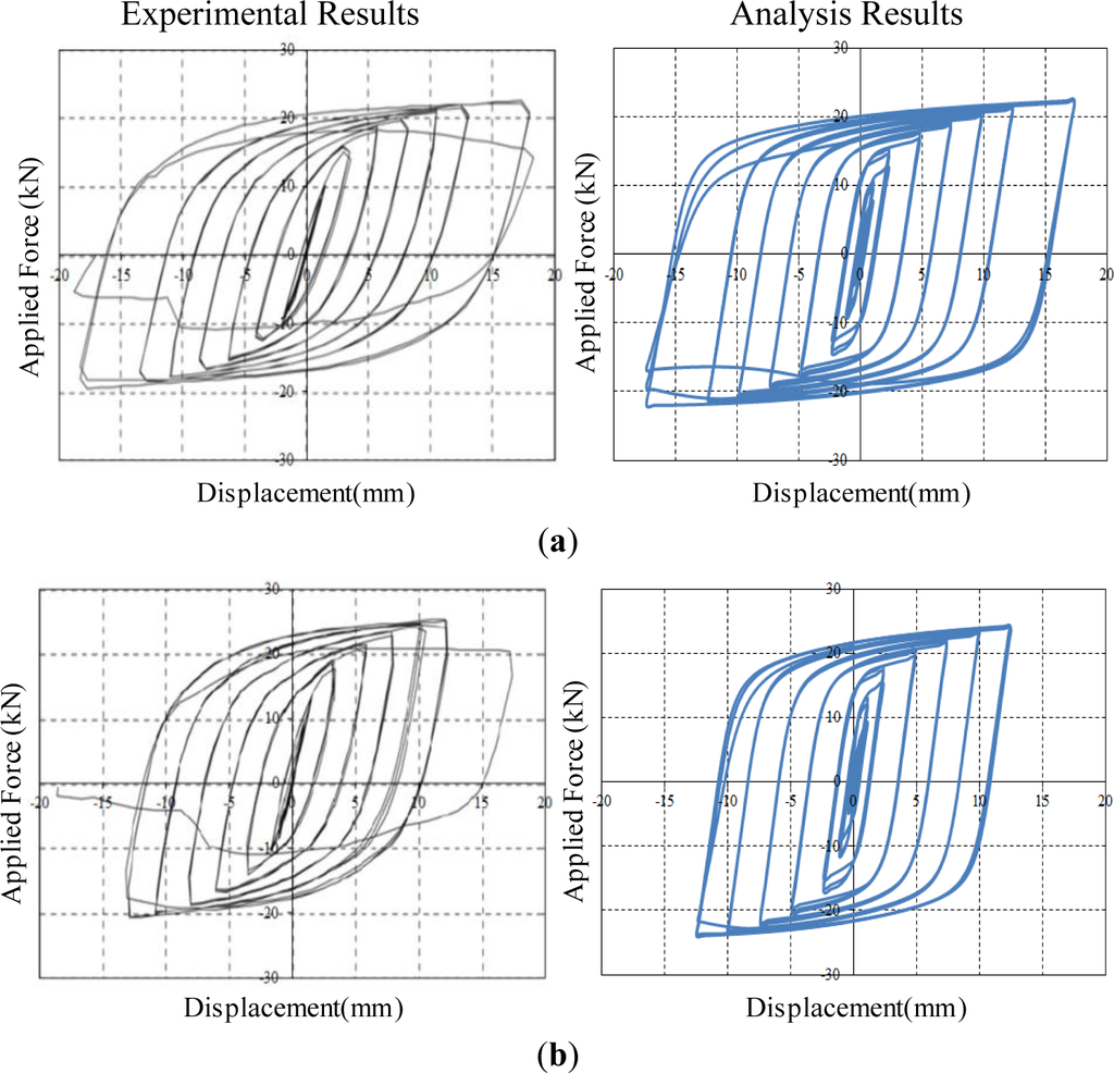 The FE analyses, where both refined solid elements and material nonlinearities are taken into consideration, are able to accurately predict the behavior of slit damper devices subjected to cyclic loading. Figure 8 shows applied force vs. corresponding displacement hysteresis curves for steel slit damper models. The detail about force (P) and displacement (δ) measurement is presented in Figure 4b. According to individual specimens, analysis results are compared with experimental results in an effort to verify the adequacy of FE modeling under the same displacement loading history. Three cycles were conducted at each amplitude. The experimental tests were carried out until specimens completely failed by fracture.