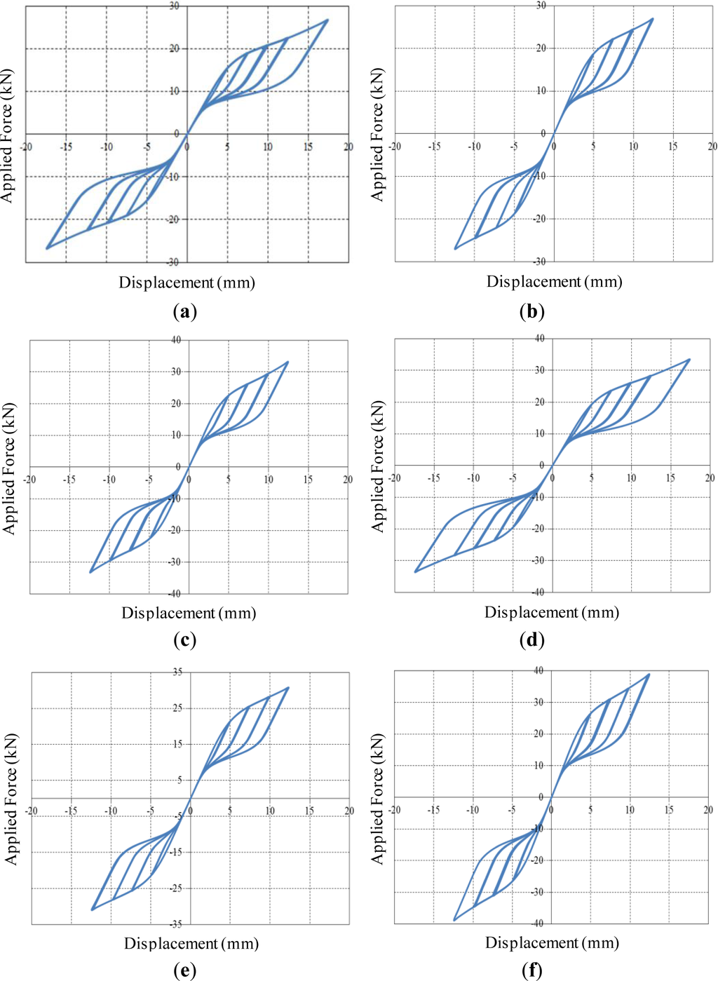 Figure 9 shows applied force vs. corresponding displacement hysteresis curves for superelastic SMA slit damper models. It is interesting to note that all of the superelastic SMA specimens behave in a similar pattern. They show a unique behavior characterized by a flag-shape hysteresis loop under cyclic loading. As we expected, excellent recentering responses indicating nearly zero permanent deformation upon unloading are observed in the simulating curves. Owing to the restoration of superelastic SMAs, strength degradation does not take place regardless of the geometric nonlinearity. Besides, the superelastic SMA slit damper devices display higher post-yield strength and more flexible stiffness than the steel slit damper devices. It can be clearly shown that the mechanical properties for base materials have a significant influence on the behavior of slit damper devices. The superelastic SMA slit damper devices possess superior performance in terms of flexible initial slope, post-yield strength and recentering behavior compared to the conventional steel slit damper devices. Similar to the steel slit damper devices, superelastic SMA slit damper devices with the relatively higher b/l0 ratio (i.e., SL6-SMA specimen) can sustain larger shear forces.