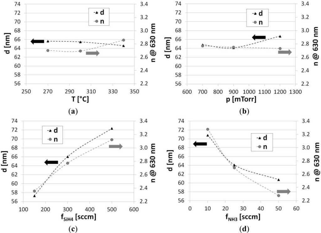 After the first set of deposition processes, d and optical properties of the deposited SiNx films have been measured. Spectroscopy ellipsometry measurements have shown that d of SiNx films depending on the process parameters is in the range from 51.1 to 72.5 nm, which corresponds to the deposition rate from 10.2 to 14.5 nm/min, respectively. It has to be emphasized that Figure 2 is prepared according to the analysis of obtained results with Taguchi’s method, and represents only the influence of the deposition parameters on films properties. The analysis has demonstrated that the most significant influence on d have fSiH4 and fNH3, which cause its increase and decrease, respectively (Figure 2c,d). The impact of other examined process parameters is less significant. The increase of T and p is followed by slight decrease and increase of d, respectively (Figure 2a,b).
