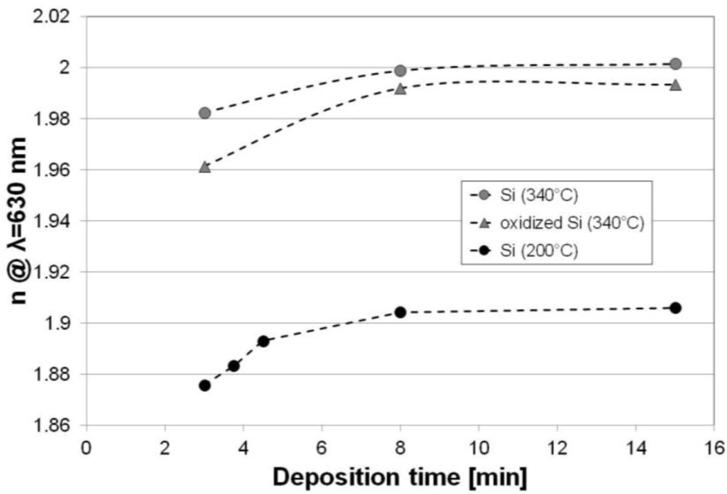 Further investigations have been focused on P7 deposition process parameters set. At first, we varied only T and the deposition time, which are the most often key parameters for T-sensitive, e.g., polymer containing devices and when d of the films matters, respectively. In order to determine the influence of the substrate material, at this stage of the experiment we deposited the films simultaneously on Si and oxidized Si. It has been found that decrease of the T from 340 to 200 °C results in significant decrease (by almost 0.1) in n of the films (Figure 4). Moreover, films deposited at higher T (340 °C) on oxidized Si show slightly lower n than those obtained directly on Si wafers. For films deposited at T = 200 °C on both Si and oxidized Si wafers, the difference in their n is imperceptible (not shown here). Moreover, for the investigated substrates n of the films increases with deposition time, especially at initial stage of film growth. For thicker films (d > 80 nm), n remains independent on deposition time. The phenomenon of n(d) dependence has been discussed elsewhere [27] for Si-rich SiNx films and it is likely to be related to densification of the film and releasing of hydrogen with deposition time, as well as stress induced in the film by the substrate at initial stage of the growth. Similar dependence of substrate material on n has also been observed for diamond-like carbon deposition and attributed to different thermal and electrical properties of the substrates, corresponding to differences in the density of ions in the plasma above the two surfaces [31]. When the process T is lower, the thermal conductivity of the substrate is less important when properties of the film are discussed.