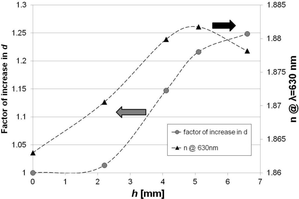 Since the distance between the electrode and the sample surface is very crucial from the point of view of properties of the films, we placed the sample on a holder’s bar allowing for changing distance (h) between the Si wafer and the holder’s surface. The obtained results of d and n where d is referred to the thickness obtained for sample on the holder, is shown in Figure 6. Both d and n of the films increase with h. The dependence is nonlinear, and for the 15 min-long process the increase reaches 17 nm/mm and 3.4 × 10−3 RIU/mm in range between 2.2 to 5.1 mm above the holder’s surface for d and n, respectively. When h > 5.1 mm, the increase in d is reduced and followed by slight decrease in n. In the investigated h range, the maximum d (25% higher than on the surface) is reached when the sample is held 6.8 mm above the electrode. The decrease in n observed for sample held at this level can be induced by lower temperature of the substrate when it is away from the electrode. The influence of temperature on n and d has been discussed above.