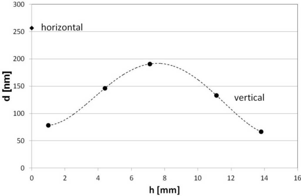 In order to confirm the effect of increase of the parameters with distance from the electrode, we positioned Si wafer on the holder perpendicularly to the holder’s surface. The process was 15-minutes-long. Thickness of the films on the horizontally (placed on the holder surface) and vertically oriented samples is shown in Figure 7. It can be clearly seen that 7 mm above the surface, the film is deposited as significantly thicker than near to the electrode. The maximum of d corresponds well with the results obtained when the elevated sample was investigated. However, in the case of this experiment, the factor of thickness variation referred to as d on the sample placed horizontally on the holder reaches 0.75.