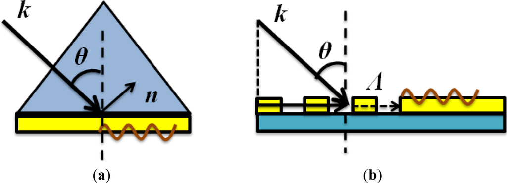 where ksp represents the wave vector of surface plasmons and k0 is the wave vector of the incident light in vacuum. εm and εd are dielectric constants of metal and dielectric, respectively. From the equation above, it is clear that direct conversion from propagating electromagnetic waves into surface plasmons is impossible due to the mismatch of their wave vectors. There are many different ways to solve this problem and the most commonly used ones are Kretschmann/Otto configurations and gratings, as illustrated in Figure 1.