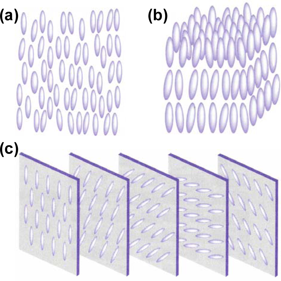 Generally speaking, there are three phases of thermotropic liquid crystals, known as the nematic phase, smectic phase, and cholesteric phase. Figure 2a illustrates the nematic phase in which only long range orientational order of the molecular axis exists. Figure 2b shows the smectic phase in which one-dimensional translational order as well as orientational order exists. Figure 2c illustrates the cholesteric phase of a liquid crystal by viewing the distribution of molecules at several planes that are perpendicular to the helical axis. The cholesteric phase is actually a nematic type of liquid crystal except that it is composed of chiral molecules. As a consequence, the structure acquires a spontaneous twist in line with a helical axis normal to the director. The twist can be right-handed or left-handed depending on the molecular chirality. Under proper treatment, a slab of nematic liquid crystal can be obtained with a uniform alignment of the director. Such a sample exhibits uniaxial optical symmetry with two principal refractive indices no and ne. The ordinary refractive index no is for light with electric field polarization perpendicular to the director and the extraordinary refractive index ne is for light with electric field polarization parallel to the director. The birefringence (or optical anisotropy) is defined as ∆n = ne − no. If no < ne, liquid crystal is of positive birefringence, whereas if no > ne, it is of negative birefringence. In classical dielectric theory, the macroscopic refractive index is related to the molecular polarizability at optical frequencies. The existence of the optical anisotropy is mainly due to the anisotropic molecular structures. In the optical regime, and , thus For most liquid crystals, the ordinary refractive index is around 1.5. The optical anisotropy plays an essential role in changing the polarization state of light in liquid crystals.