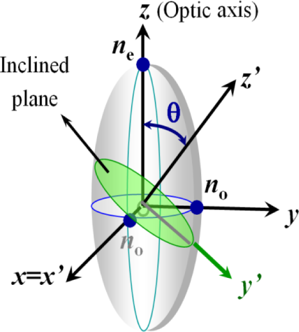 For light propagating in the liquid crystal with an incident angle θ relative to the optical axis, shown as Figure 3, two eigen refractive indices are seen by the light with two modes of propagation. One mode with its polarization direction perpendicular to the plane formed by the wave vector and the optic axis is called ordinary wave, which sees a refractive index of no (independent of the incident angle ). The other one with its polarization direction parallel to the plane formed by the wave vector and the optic axis is called extraordinary wave, which sees an effective refractive index (dependent of the incident angle θ). The effective refractive index seen by the light can be written as: