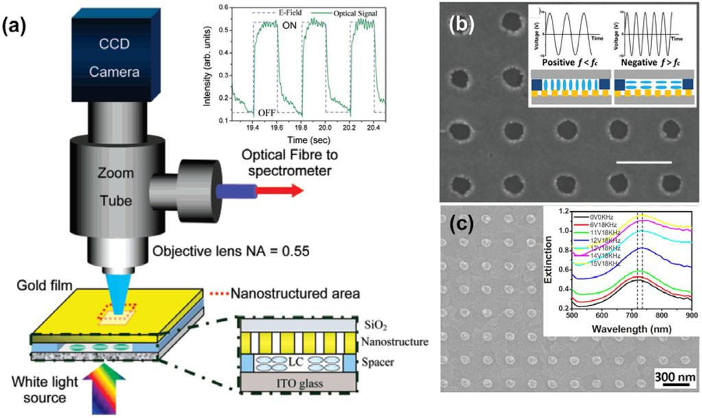 Electric fields have very strong impacts on rod shape of liquid crystal molecules. When the liquid crystal molecules are subject to an electric field, one end of a molecule has positive charges, while the other end is negatively charged, forming an electric dipole. As a result, the director of the liquid crystal molecules will be re-oriented along the direction of an external electric field. Therefore, electric field is the most commonly used method to drive the liquid crystal devices. Utilizing this characteristic of the liquid crystal, efforts have been made to combine liquid crystals with periodically nanostructured metal films to develop electronically controlled transmission, reflection, and absorption of the plasmonic structures, concerning their applications on switches, filters, and modulators. One example is given by Dickson et al. [55], who have demonstrated precise control over surface plasmon dispersion and transmission of gold nanohole arrays using liquid crystals. A schematic of the experimental setup is shown in Figure 5a. A liquid crystal layer with the thickness controlled by the spacers is sandwiched between a conductive indium-tin-oxide (ITO) glass substrate and a gold film with nanohole arrays milled by using a focused ion beam. White light impinging from the ITO side of the sample will pass through the liquid crystal layer and then reach the nanostructures to excite different surface plasmon polariton modes. Upon applying voltages, electric fields are built up across the ITO substrate and the gold film, and the liquid crystal molecules tend to realign along the electric field direction. As a result, effective refractive index at the interface of gold/liquid crystal is changed and subsequently results in a variation on the surface plasmon dispersion relation; thus, changing the excitation conditions of certain plasmon modes. This change is phenomenally reflected as a transmission modulation from the spectrum and provides us an active control of surface plasmon modes. De Sio et al. [57] also reported that a carrier accumulation layer in the proximity of the ITO substrate can be formed under the external electric field, hence modifying the effective refractive index around the metallic nanostructures and affecting their plasmonic resonances subsequently. To achieve an additional degree of control freedom, dual-frequency liquid crystal (DFLC) therefore is much preferred in designing an active plasmonic device, because it responds to the applied voltages with different frequencies. DFLC can change its sign of dielectric anisotropy from positive to negative, or negative to positive, upon the frequency change of the applied electric fields [73,74]. Complementary gold nanodisk and nanohole arrays have been demonstrated using electron-beam lithography followed by lift-off process, which are promising carriers to build plasmonic devices, as shown in Figures 5b,c. By overlaying a DFLC layer on these nanodisk and nanohole structures, reversible tuning of plasmonic resonances and transmission have been demonstrated. In these hybrid systems, homeotropic alignment of DFLC was set at the initial state by using a self-assembly alignment layer of hexadecyl trimethyl ammonium bromide (HTAB). When the frequency of the applied electric field is lower than the crossover frequency of DFLC, and all the liquid crystal molecules will keep the homeotropic alignment, i.e., perpendicular to the substrate, which is independent of applied voltages. Once the applied frequency exceeds the crossover frequency, the liquid crystal molecules tend to prefer the homogeneous alignment, i.e., parallel to the substrate, which is dependent on applied voltages. As a result, the switching/tuning effect with various transmissions can be easily obtained by varying applied voltages. Another example of tuning nanorod plasmons using liquid crystal is given by Khatua and co-workers [58]. With the applied external voltage as low as 4 V, complete modulation of the polarized scattering intensities of individual gold nanorods can be simply achieved. Note that the demonstrated strategy can be readily translated to other antenna architectures with more complex designs and various plasmonic elements for the electrical manipulation of light in structures with nanoscale dimensions.