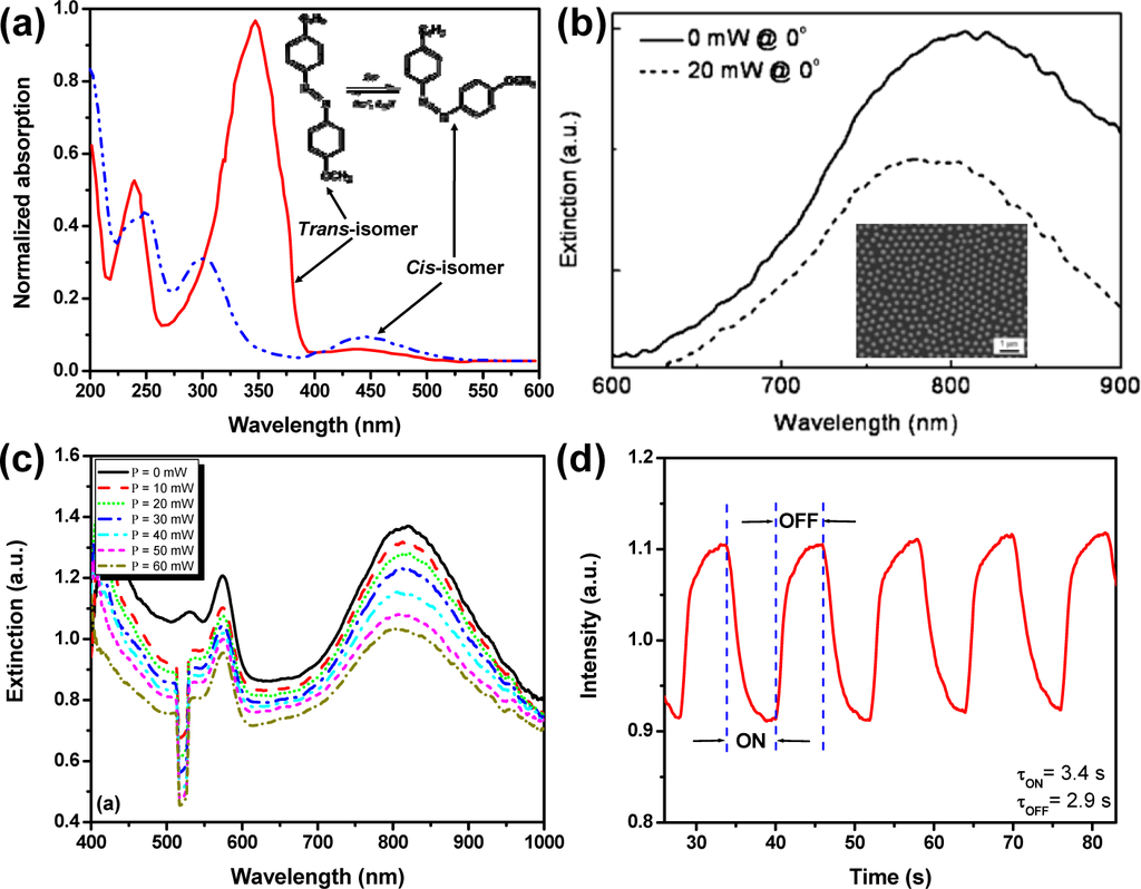 All-optical tuning method has been widely applied in liquid crystal based optical elements like spatial light modulator, filter, reflector, etc.; and it has many advantages such as non-contact tuning, low power consumption, and friendly integration, making it an exciting concept to be applied on light driven liquid crystal based devices. As compared to the electrical tuning method, light driven method requires: (1) no conductive ITO substrates; (2) low power consumptions and (3) large operation windows covering UV to mid-IR. Azobenzene and its derivatives are a widely used guest in a liquid crystal host. They have a trans-cis reversible isomerization dynamic behavior upon exposure to a UV or visible light beam. The isomerization will disrupt the local order of surrounding liquid crystal molecules in the mixture, resulting in realignment of those liquid crystal molecules to exhibit a refractive index change. Such an index change has been utilized for dynamic control of many photonic devices, such as switchable gratings [51,76–79] and photonic crystals [80,81]. It is also straightforward for dynamic control of surface plasmons [52,82,83]. One example of a light-driven plasmonic switch has been demonstrated by Hsiao et al. [52] with a light responsive liquid mixture consisting of nematic liquid crystals and an azobenzene derivative. 4-butyl-4’-methyl-azobenzene (BMAB) is used to induce the switching effect. Figure 7a shows the spectral changes of BMAB under UV exposure that reflects its trans-cis isomerization process. Figure 7b shows the extinction spectra of a photoresponsive liquid crystal/gold nanodisk array (see the inset of Figure 7b) cell at normal incidence of a probing beam before (solid curve) and after (dashed curve) the light pump (λ = 420 nm, I = 20 mW) at the incident angle of 45°. One can observe a 30 nm blue-shift of the extinction peak. Figure 7c shows the spectral changes of extinction in another azo dye (methyl red) doped grating integrated with the same gold nanodisk array [83]. The switching effect before and after the light pump is shown in Figure 7d with both switching “ON” and “OFF” time less than 4 seconds, which is the typical response time for the azobenzene and its derivatives under the continuous light pump. However, under the pulsed laser pump, the response time of azobenzene doped liquid crystals could reach nanoseconds since the photoisomerization of azobenzene from trans-state to cis-state could undergo the pathway of either π−π* rotation or n−π* inversion with different response speeds [84].