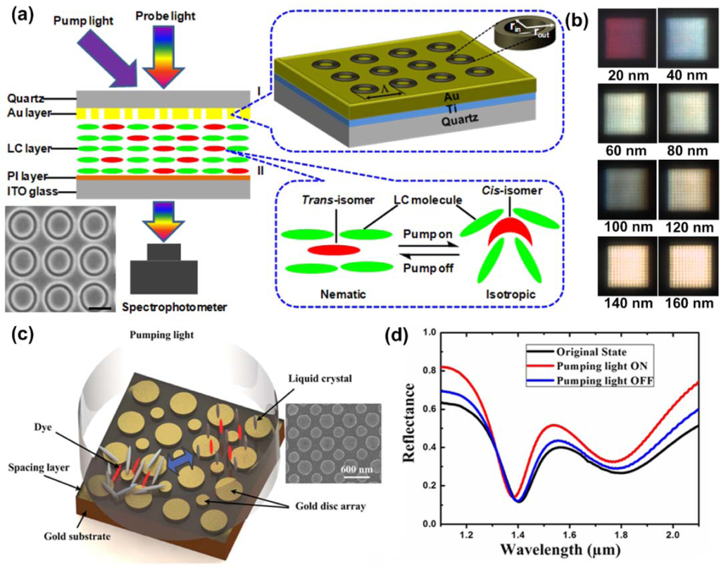 Based on the same working mechanism, we have also demonstrated light-driven plasmonic color filters with high optical transmission and narrow bandwidth by overlaying a layer of photoresponsive liquid crystals on gold annular aperture arrays (AAAs). The schematic of the light-driven plasmonic color filters and experimental setup is shown in Figure 8a. The enlarged Part I in Figure 8a shows the fabricated square pattern of gold AAAs using focused ion beam lithography. The inner and outer radii of each individual aperture are labeled as rin and rout, respectively. The magnified Part II in Figure 8a shows the working mechanism of the optical driving process: a reversible nematic–isotropic phase transition induced by the trans-cis photoisomerization of the photochromic liquid crystals. The gold AAAs with various aperture sizes and periods have been reported to generate different colors in the visible range. The addition of photoreponsive liquid crystals will then make the transmission of color filters optically tunable. The photosensitive liquid crystal mixture has similar composition as other mixtures discussed above. With its large birefringence Δn = 0.225 (at the wavelength of 589 nm, no = 1.521, ne = 1.746), it offers major intensity modulation of the transmitted color through the plasmonic color filter shown in Figure 8b, where the intensity of each individual color generated from plasmonic structures can be further tuned, as confirmed by both simulations and experiments in the reported work [39]. Therefore, any color could be achieved through the composition of three tunable primary red, green and blue color filters. This all-optical tuning behavior is highly reversible and reproducible, making such a kind of color filter promising in all-optical information processing and displays. Another useful device is plasmonic absorbers, which can exhibit extraordinary absorption efficiency of more than 90% at designated wavelength bands by engineering nanostructures with different shapes and sizes. Inclusion of birefringent nematic liquid crystals in their makeup can make the absorption bands electrically or optically tuned or modulated, hence providing additional freedom to control the absorption bands. Zhao et al. have experimentally demonstrated a light-driven plasmonic absorber based on a nematic liquid crystal host doped with an azo dye [45]. Figure 8c shows the schematic of light-driven reconfigurable plasmonic absorber. A cladding layer of liquid crystals mixed with azo dyes is added on top of the plasmonic absorber. The use of azo dye is to effectively absorb the light energy and transfer the absorbed energy to heat up the liquid crystal environment. The liquid crystal used here is thermo-sensitive type with transition temperature of 35 degrees (5CB). Liquid crystal will transform from a nematic to isotropic state after heating up, along with a gradual refractive index change from 1.61 to 1.56 with the increase of temperature. The refractive index change modifies the frequency selected surfaces as well as the resonance frequency of the resonant cells formed by top gold nanostructures, and a bottom gold layer. A noticeable shift of the absorption dips of around 25 nm has been confirmed in Figure 8d. Note that the photosensitive liquid crystals with an azo group in their mesogenic structure exhibit a higher solubility compared to non-mesogenic azo-dyes [85–87]. Furthermore, the orientational order of liquid crystals still remains high in the presence of mesogenic azo dopants and their photoisomerization effect on the host liquid crystal is stronger than that of non-mesogenic dopants.