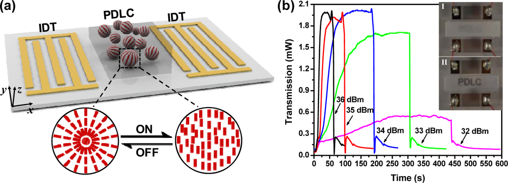 Although liquid crystal driven by surface acoustic waves (SAWs) is loosely connected to the scope of this review paper, we put it here as an insight into prospective integration of liquid crystal with micro- and nano-technologies. SAWs are sound waves propagating along the surface of a piezoelectric substrate. Its low power consumption and intactness from the driven medium make it an effective approach to re-align the liquid crystal molecules. Liu et al. [49] have demonstrated a SAW-driven light shutter based on polymer-dispersed-liquid-crystal (PDLC). A schematic of the designed light shutter is shown in Figure 9a. It consists of a PDLC film layer and two inter-digital transducers (IDTs) on a piezoelectric substrate. The PDLC film consists of liquid crystal droplets randomly distributed in a polymer matrix. Before applying SAW, the PDLC film exhibits strong scattering due to the refractive index mismatch between the polymer matrix and liquid crystal droplets, thus demonstrating a non-transparent state. When a radio frequency signal is applied to IDT, SAW is excited and then propagates along the surface. When the propagating SAW encounters the PDLCs, a longitudinal wave is induced and leaks into the PDLCs. The longitudinal wave will cause the liquid crystal molecules to realign to eliminate the refractive index mismatch, i.e., their ordinary refractive index matches with that of the polymer. As a result, the PDLC film becomes completely transparent. The acoustic wave induced streaming inside the liquid crystal rich regions as well as the temperature change caused by the attenuation of this longitudinal wave are believed to be key factors to reorient the alignment of liquid crystal molecules. Figure 9b shows the experimental results marking the “ON” and “OFF” states of the SAW-driven shutter. The word “PDLC” can be clearly observed by turning ‘ON’ the shutter, and the film is opaque when the shutter is “OFF”. We believe that such a SAW-driven liquid crystal mechanism will be applicable to the plasmonic devices as well. Our research on SAW-driven plasmonic devices incorporated liquid crystals is currently on-going.