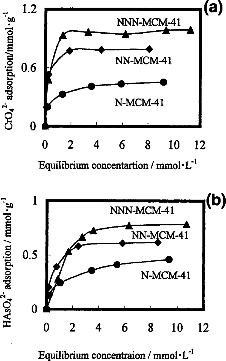 The H2N(CH2)2NH(CH2)3–functionalized MCM–41 and MCM–48 (abbreviated as NN–MCM–41 and NN–MCM–48) [196] were used for the adsorption of Fe3+, Cu2+, Co2+ and Ni2+. Then, the authors applied the used mesopores for the adsorption of arsenate. The Fe3+, Cu2+ and Co2+ ions bound to ethylenediamine (en) headgroups of mesoperes as Fe(en)2, Cu(en)2 and Co(en) whereas Ni2+ interacted with surface silanol groups. The adsorption capacities of NN–MCM–48 for these metal ions were much larger than those of NN–MCM–41. Also, it was shown that Cl− and SO42− anions inhibited arsenate adsorption on these kinds of adsorbents by different extents.