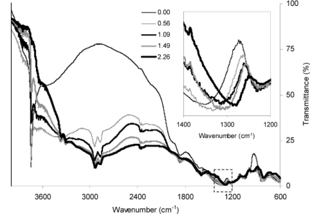 In some works, amino-functionalized MCM–41 mesopores were used for adsorption of heavy metal cations [178–180]. Yeoung et al. [178] studied the steric hindrance effect on the adsorption of Au3+, Cu2+ and Ni2+ on NH2CH2CH2CH2–, CH3CH2CH2NHCH2CH2CH2– and (CH3CH2CH2)2NCH2CH2CH2–functionalized MCM–41 which their abbreviated names are NH2–MCM–41, NHR–MCM–41 and NR2–MCM–41, respectively. The results showed that only Au3+ (from the mixture of these ions) was selectively adsorbed on these compounds, resulted from interactions of Au3+ ions with lone pair electrons of N atom of amine groups. They observed that the adsorption capacity of Au3+ decreased from NH2–MCM–41 to NR2–MCM–41 which was due to the increase in steric hindrance of these spacious groups on the lone-pair electrons of N atoms. Authors showed that Au3+ was adsorbed on NH2–MCM–41 with the amine loading ratios higher than 0.6 mmol/g. This was because, at low amine loading ratios (<0.6), strong H-bonding between silanol and amine groups prevented interactions of amine groups with Au3+ ions whereas at the amine loading ratio higher than 0.6 amine groups formed patches of amino-derived areas and this destroys H-bonding between silanol and amine groups which was revealed at the peak shifting of around 1300 cm−1 in the FT-IR spectra (Figure 11). The used NH2–MCM–41 was washed by 5 M HCl and all the adsorbed gold ions were recovered and the regenerated adsorbent retained its adsorption capacity after repeating usages.