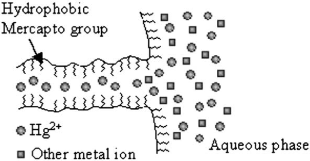 Dai et al. [183] studied effect of hydrophobicity of functional groups on their adsorption capacity. HMS, SBA–15 and PME (PMO material bridged with ethylene groups) functionalized with N-((trimethoxysilyl)propyl)-N,N,N-tri-n-butylammonium (TSPBC) and N-((trimethoxysilyl)propyl)-N,N,N-trimethylammonium (TSPMC) ions were used for the adsorption of hydrophobic ReO4− ions [183]. The results showed that TSPBC-functionalized HMS, SBA–15 and PME had bigger qmax values for the adsorption of ReO4− than those functionalized with TSPMC. This was due to the higher hydrophobic character of butyl groups compared to methyl groups that enhanced the adsorption of ReO4− ions. When a cationic surfactant (here CTAC) was used for synthesizing mesopores (called as MEB sample), its chloride ions attached to the protonated silanol groups and anion-exchange sites and hindered the adsorption of ReO4− ions. To avoid high chloride content in these mesopores, authors used TSPBC and a neutral surfactant (rather than CTAC) to synthesize mesoporous compound (called as NMEB) that increased greatly its qmax for the adsorption of ReO4− ions compared to MEB. In another work, a bifunctional HMS, prepared by mercaptopropyl and aminopropyl groups, was used for the adsorption of Hg2+, Cu2+ and Cd2+ [184]. Heavy Metal ions were adsorbed by –SH heads of mercaptopropyl groups. Due to higher affinity between –SH group and different mechanisms of its adsorption, the Hg2+ adsorption and its adsorption selectivity increased greatly compared to Cu2+ and Cd2+ (Figure 12). Hg2+ can be adsorbed on the inner surface of pores whereas Cu2+ and Cd2+ were adsorbed on the outer surface of adsorbent or near the pore openings. As reported [36,180,185–187], −SH groups of organically-functionalized mesopores have a great qmax for adsorption of Hg2+. An example of a compound with two functional groups is 1-benzoyl-3-propylthiourea-functionalized MCM–41 (MCM–41 BTU) which was synthesized through a two-step modification process [188] to better control removal of Hg2+ and to prevent unnecessary pore blocking. In the first step they prepared 3-aminopropyl-MCM–41 (MCM–41 NH2) and in the second step, they prepared MCM–41 BTU using MCM–41 NH2. Their surface area and pore size were decreased as in order as MCM–41 > MCM–41 NH2 > MCM–41 BTU.